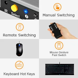 【Быстрое переключение 】 переключатель tesmart 4x1 KVM может управляться с помощью различных методов, таких как кнопки выбора передней панели, жесты мыши, горячие клавиши на клавиатуре и ИК-пульт дистанционного управления (аккумулятор CR2025 не входит в комплект). Поддержка автоматического переключения на мониторы компьютеров в указанном промежутке времени.
