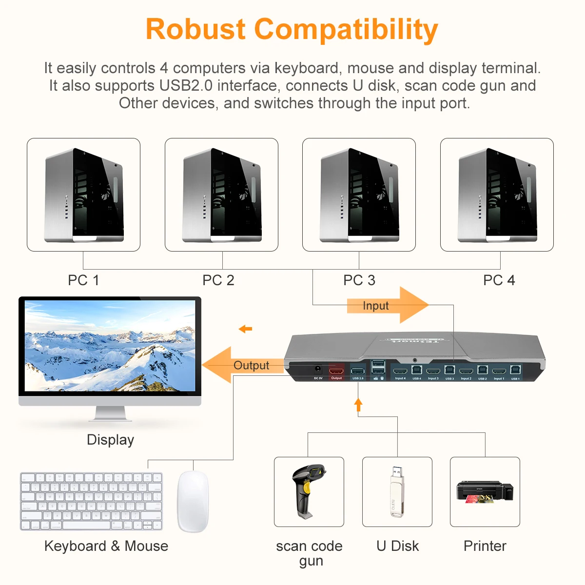 【Поддержка USB 2,0 devices】поддержка USB 2,0 hub и USB 2,0 клавиатуры/мыши. Используя порты USB 2,0 hub на KVM, вы даже можете прикрепить к KVM usb-накопитель, принтер, сканер штрих-кода или другие usb-устройства. Советы: не может поддерживать жесты мыши, горячие клавиши на клавиатуре, чтобы переключить источники ввода, когда ваша клавиатура или мышь подключены к этому порту.