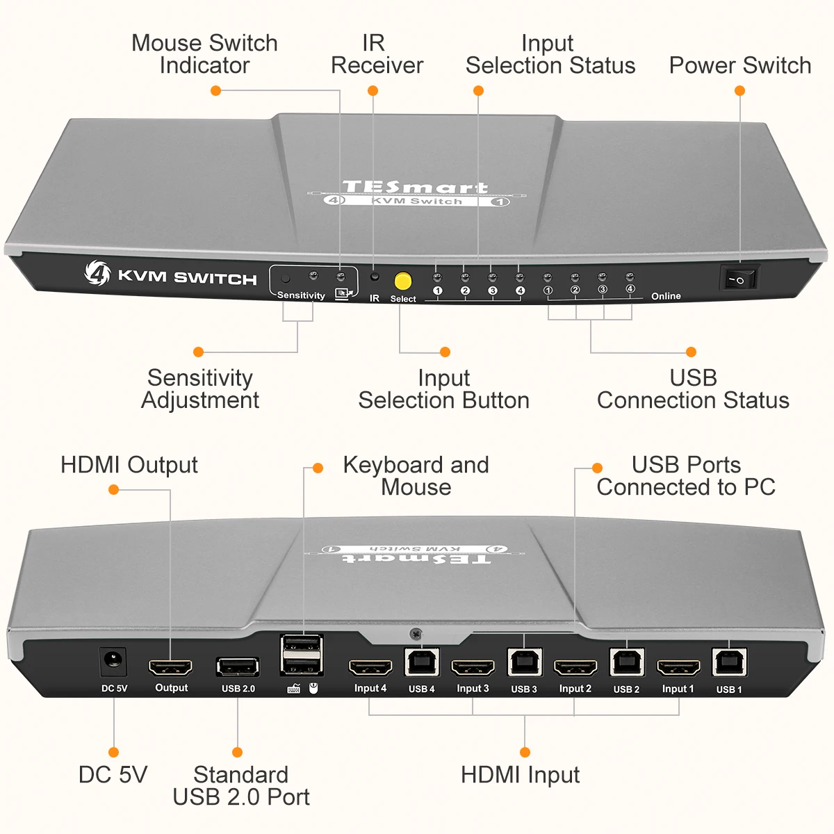 TESmart 4K 4x1 KVM переключатель 4 порта 3840x2160 @ 30 Гц с 2 шт 5ft KVM Кабели Sup порты USB 2,0 устройство управления до 4 компьютеров/серверов/DVR, чехол из алюминиевого сплава 4 входа 1 выход.