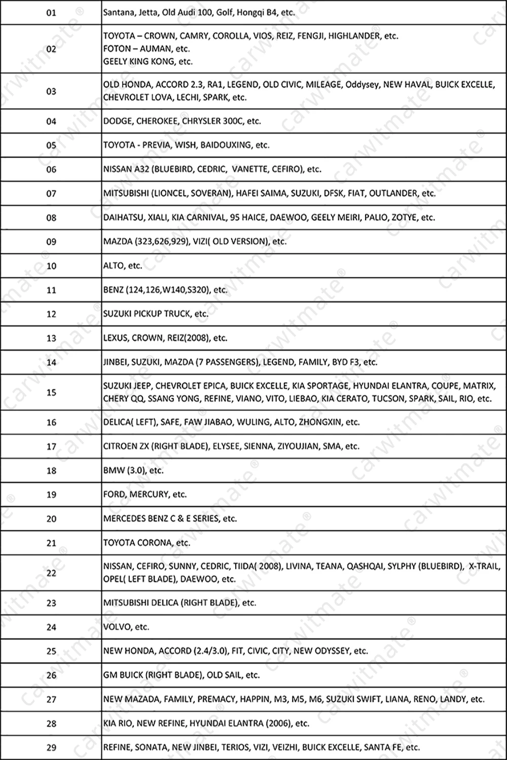 Этот пустой ключ Подходит для VW PASSAT, BORA, GOLF, AUDI A6, SKODA, POLO, TOURAN, CADDY, SAGITAR, MAGOTAN, SEAT. Если вам нужны другие типы, пожалуйста, обратитесь к следующему списку пустых ключей и сообщите нам номер ключа, который вам нужен. Если вы не сообщите нам, какой номер ключа вам нужен, и закажите этот товар, мы отправим вам пустой ключ по умолчанию № 31. Большое спасибо за понимание!