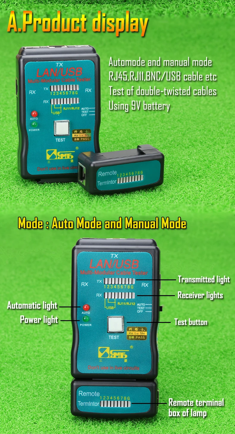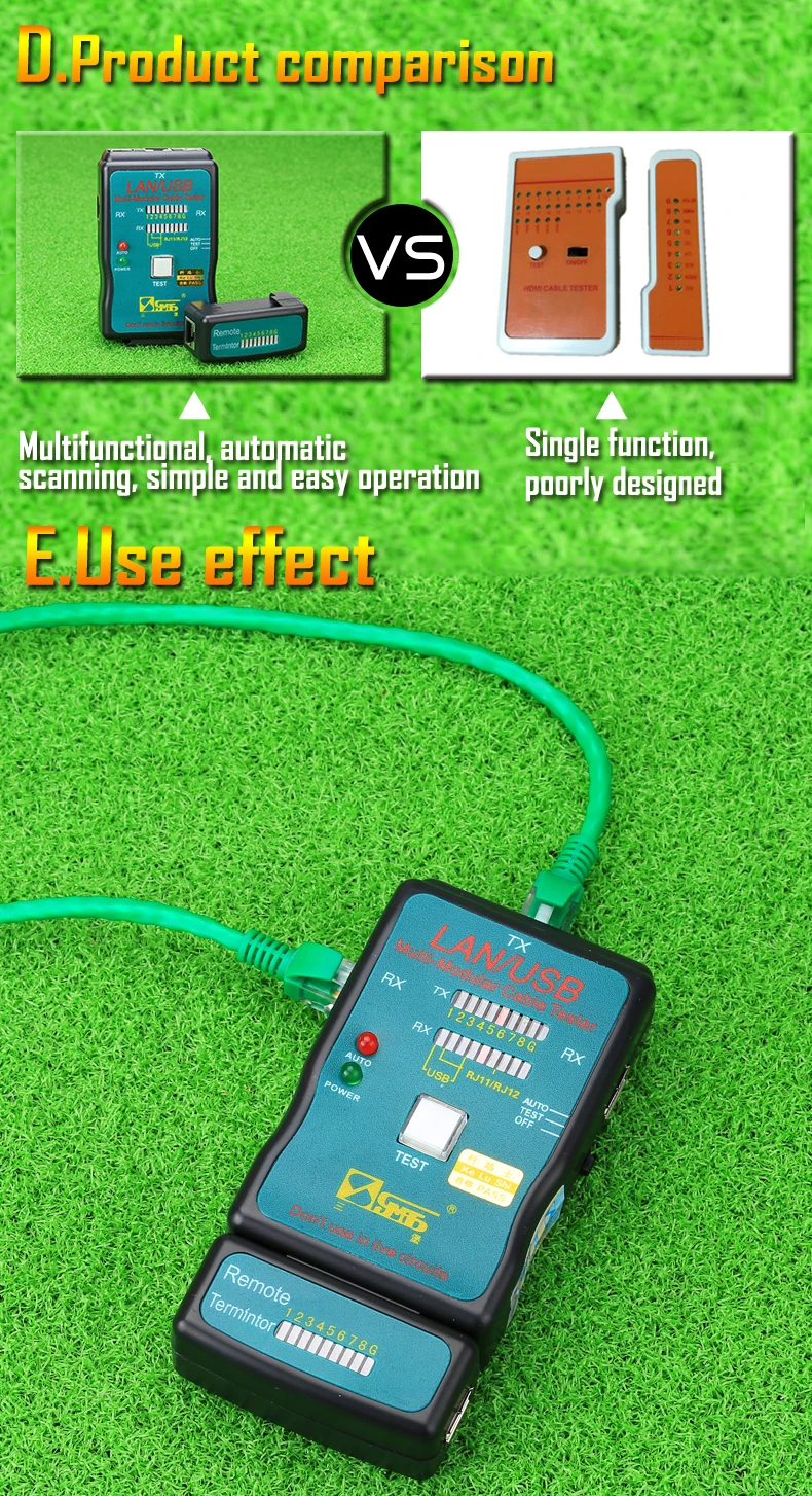 Многофункциональный инструмент измерительная линия CT-168 кабель телефонный шнур тестер Параметр Модель: CT-168 Дисплей: светодиодный дисплей Питание: аккумулятор 9 В (не входит в комплект) Тест: ручной тест-Ручная модель для выбора каждого провода для тестирования Вес: Размер: 130*22*11 Тип тестового кабеля: Сеть RJ45, RJ11/RJ12 витая пара телефонной линии, USB (A/B),BNC, RCA, коаксиальный кабель Тип кабеля: RJ45/RJ11/BNC/USB и все виды металлических проводов и т. д. Линейный заказ и место повреждения кабеля: обнаружение неисправностей, открытая цепь, короткое замыкание, обратное соединение, перекрестное и веревочное вокруг. Без «удаленного набора» он также может сделать тест отдельно от основного тестового набора.