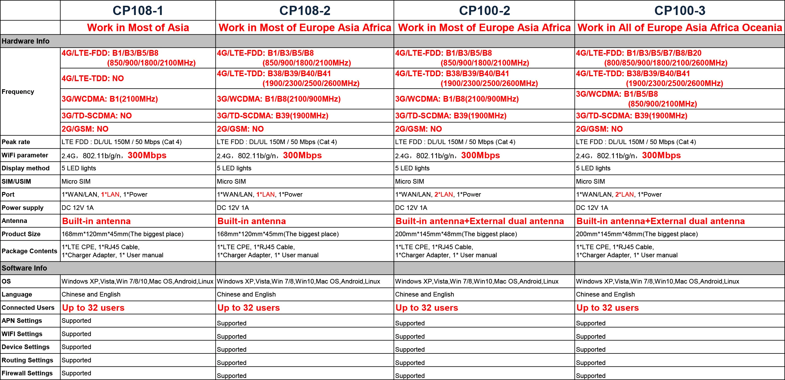 Примечания: Этот маршрутизатор отключен. Но разные операторы имеют разные частоты в разных странах. Пожалуйста, проверьте роутер, работает ли он с вашим оператором или нет, ознакомившись с приведенной ниже таблицей. Если вы находитесь в стране, или нет, пожалуйста, свяжитесь с вашим оператором, чтобы получить частоты, которые он работает, или Посмотрите на веб-сайт ниже. //en.wikipedia.org/wiki/List_of_LTE_networks (нажмите на картинку ниже, чтобы посетить).