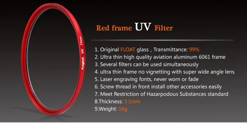 УФ-фильтр Улучшите контрастность к видео и цифровым изображениям, минимизируя количество света. Особенно полезно в областях высокой высоты, снега или пляжа, устраняя нежелательные синие отливки. Импортированное Оптическое стекло, верхний уровень пропускания. Материал: оптическое стекло