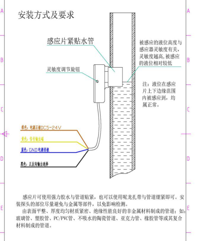 * Примечание: NPN выход: Нет индуктивного выхода с низким выходом Выход PNP: нет индуктивного выхода высокого уровня, нет выхода Высокая и низкая Выходная мощность: есть высокий уровень индуктивного выхода без индукционного низкого уровня Три, характеристики продукта 1, XCK-Y26-xxx серии датчиков, подходящих для неметаллической стенки труб без необходимости прямого контакта с жидкостью, не будет сильной кислотой и сильной щелочной коррозионной жидкостью, не влияет на масштаб или другой мусор. 2. Интеллектуальная Регулировка уровня и функция памяти уровня, Отображение уровня жидкости, может реализовывать больше проводов серии; Поддержка уровня выхода, NPN, PNP выход сигнала (выбор и производитель может). 3. Тест является точным и стабильным, может обнаруживать уровень кипящей воды. 4. Чистая структура электронной цепи, немеханическая работа, производительность, стабильность и долговечность. 5, высокая стабильность, высокая чувствительность, сильная способность анти-помех, не подвержена внешним электромагнитным помехам, для вмешательства в частоту питания и помех в обычном режиме, чтобы сделать специальное лечение, чтобы быть совместимым со всеми адаптерами питания 5 ~ 24 В на рынке. 6, сильная совместимость, с помощью различных материалов, не связанных с сосудов, таких как пластик, металл, стекло, керамические контейнеры, толщина стенок индукционной трубы составляет 20 мм; контейнер для обнаружения уровня жидкости или трубопровод подходит для всех видов поверхностей, изогнутых, цилиндрических. 7, широкий диапазон напряжения (5 ~ 24 В), подходит для подключения различных схем и приложений продукта. Три, принцип работы Интеллектуальный бесконтактный датчик уровня жидкости-это индукционный конденсатор с использованием воды для обнаружения наличия жидкости, без жидкости в датчике приближения, датчик из-за распределенной емкости, таким образом, индуктор имеет определенную статическую емкость, когда уровень жидкости поднимается близко к датчику, Паразитная емкость будет соединена со статической жидкостью емкость, значение емкостной датчик становится большим, изменение входного сигнала ёмкости к преобразованию сигнала IC управления, изменение емкости изменится в сигнал, а затем определённым алгоритмом для обнаружения и определения степени изменения, Когда изменение превышает определенный порог, уровень достигает точки индукции. Четыре, параметры продуктаНазвание входаПараметрВходное напряжение (вин)DC 5 ~ 24 VПотребление тока5 мАВыходное напряжение (Gao Dianping)ВинВыходное напряжение (низкое)0 ВВыходной ток1 ~ 100 мАВремя отклика500 мсРабочая температура окружающей среды0 ~ 85 CИндукционная чувствительностьНаружный диаметр трубы D (мм)Максимальная толщина стенки L (мм)D = 10020 + 2100> D = 8015 + 280> D = 6012 + 1,560> D = 407 + 140> D = 305 + 130> D = 203 + 120> D = 101,5 + 0,5Применимый диапазон диаметра трубыБолее 10 ммОшибка уровня1,5 ммВлажность5% ~ 100%Текстура материалаАБС-пластикВодонепроницаемое свойствоIP65Пять, условия применения(A) измеренная вязкость жидкостиНормальное измерение динамической вязкости <10 МПа. 10 МПа <динамическая вязкость <30 мпа может повлиять на обнаружение. Динамическая вязкость> 30 мпа из-за большого количества жидкости, прикрепленной к стенке контейнера, не может измерить.Примечание: с увеличением температуры вязкости большая часть жидкости с высокой вязкостью пр