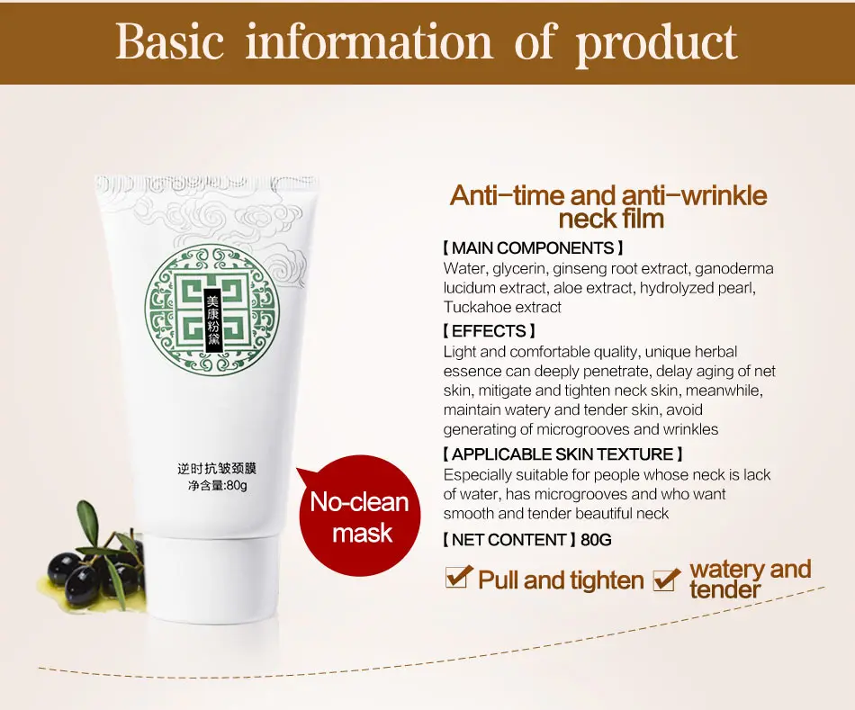 [Основные компоненты] Вода, глицерин, экстракт корня женьшеня, экстракт ганодермы lucidum, экстракт алоэ, гидролизованный жемчуг, экстракт Tuckahoe. [Эффекты] светильник и удобное качество, уникальная травяная эссенция могут глубоко проникать, задерживать старение чистой кожи, смягчать и подтягивать кожу шеи, тем временем, поддерживать водянистую и нежную кожу, избегайте образования микропаза и морщин. [Подходящая текстура кожи] Особенно подходит для людей, у которых нет воды в шее, есть микропазы и которые хотят гладкой и нежной красивой шеи.