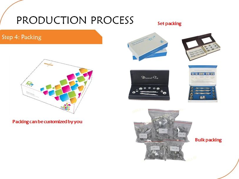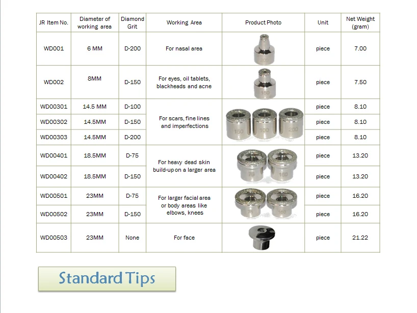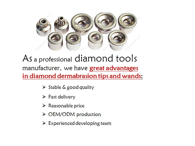 Чем больше диаметр, тем тоньше зернистость. Очистите алмазные наконечники спиртом, затем стерилизуйте их УФ-светильник или при высокой температуре. Замените хлопковый фильтр внутри алмазного наконечника или Газового соска после 5 ~ 6 клиентов