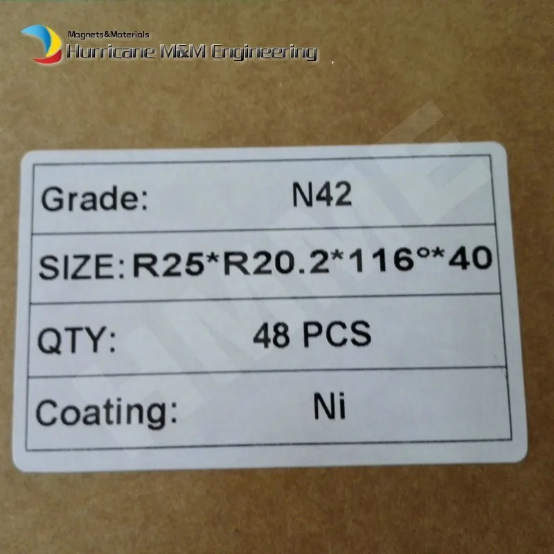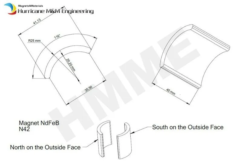 Продукт: дуговые магниты NdFeB класс: N42 Размеры: OR25 * IR20.20 * 116 градусов * 40 мм, как показано ниже Намагничивание DWG: в паре, половина N полюса снаружи и другая половина S полюс наружное покрытие: NiCuNiКоличество: 48 шт.