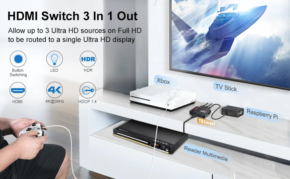 Этот HDMI коммутатор позволяет получить доступ к нескольким hdmi-устройствам (таким как dvd-плееры и спутниковые телеприставки) на один HDMI-дисплей. Он передает видео высокой четкости (несколько разрешений до 4K) и цифровое аудио от любого из нескольких источников к дисплею. Нет необходимости в дополнительных адаптерах питания, подключении и воспроизведении. Это удобное и экономичное решение! Это лучший выбор для системы домашнего кинотеатра и двух пользователей компьютеров. Не нужно беспокоиться, чтобы вручную вставить различные разъемы HDMI для просмотра различных источников сигнала HDMI.