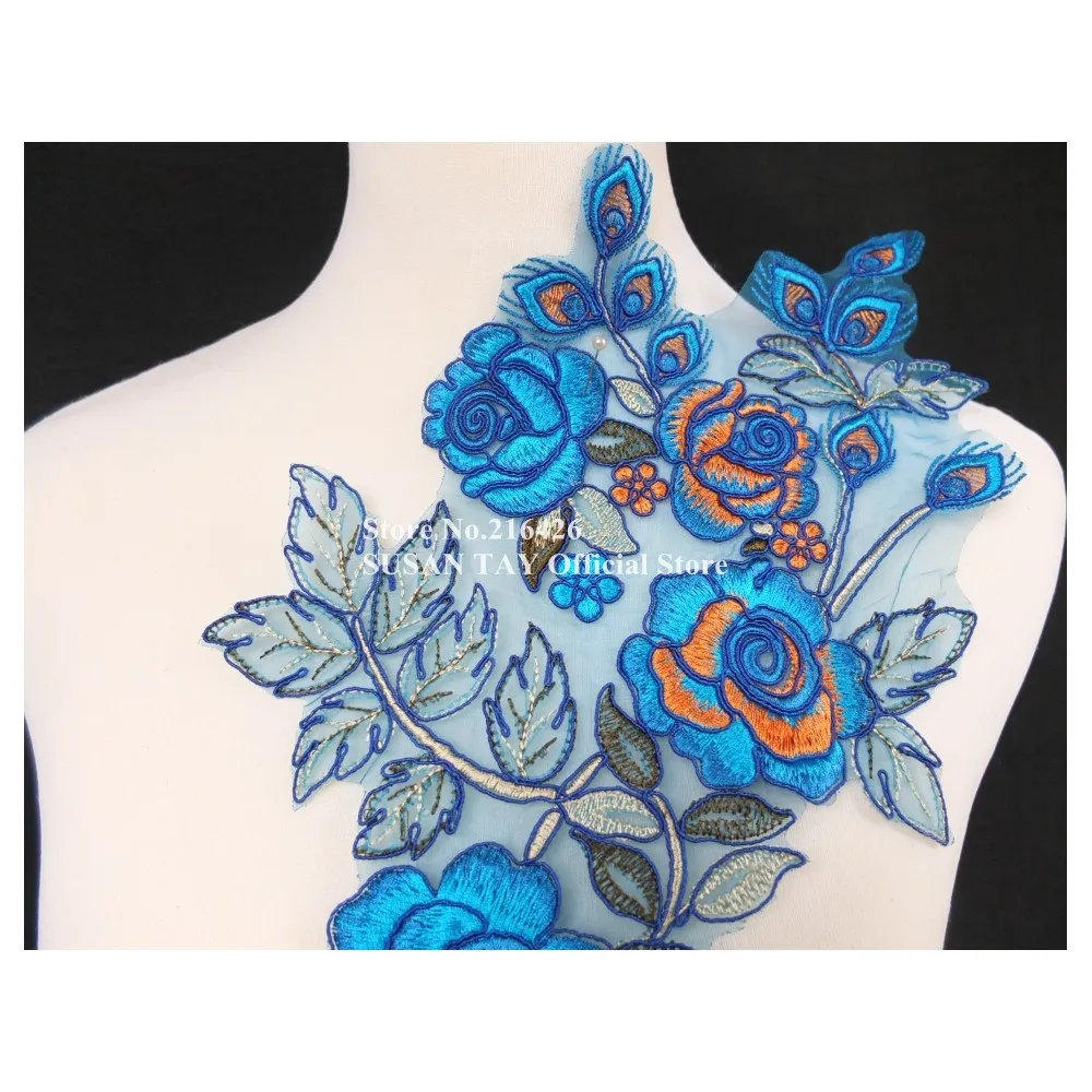 2 шт./лот x Новый длинный синий/оранжевый цветок вышивка органза кружева аппликации воротники вырез Патчи Платье для танцев сценический костюм свадебное украшение Одежда Аксессуары Одежда DIY Швейные изделия BNC117I