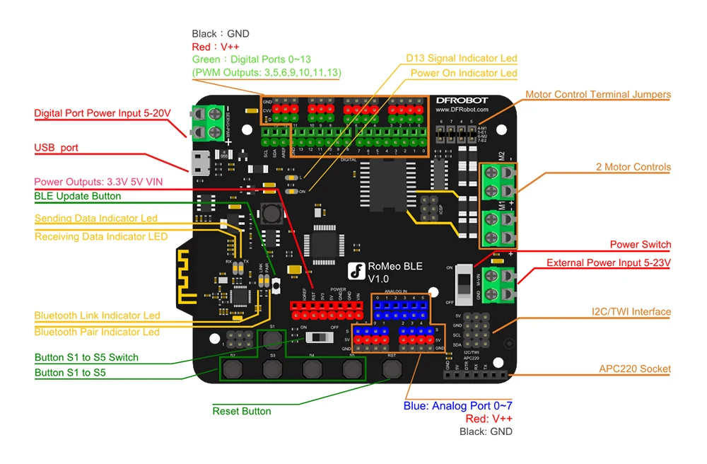 Romeo family-это универсальная плата управления Arduino, специально разработанная для робототехнических приложений от DFRobot. Он извлекает пользу из платформы с открытым исходным кодом Arduino, он поддерживается тысячами кодов с открытым исходным кодом и может быть легко расширен с помощью ваших щитов Arduino. Интегрированный 2 способа двигателя постоянного тока и Беспроводная розетка позволяет начать ваш собственный робот проект сразу же без необходимости дополнительной мотор драйвер. Не только имеет драйвер двигателя, Romeo также разработан, чтобы иметь дополнительную мощность для сервоприводов, которые нуждаются в большем токе. Romeo также оснащен стандартным 3Pin-out DFRobot и совместим с датчиками и приводами гравитационной серии. Сотни датчиков теперь подключаются к Romeo. Вы также можете проверить Bluetooth Microcontrollor выбор руководство для получения дополнительной информации. Romeo BLE-новый член семьи Ромео. Этот робот-контроллер наследует все функции контроллера Romeo all-in-one, Romeo BLE имеет интегрированный bluetooth 4,0, это первый раз, чтобы дать роботу контрольную панель мощность легкой установки. Благодаря bluetooth 4,0, Romeo BLE поддерживает загрузку sketch wireless, что означает, что вам не нужно подключать кабель для загрузки нового кода. Просто нужен адаптер USB bluo Link, Romeo BLE готов к обновлению через воздух, что так удобно для применения робота. С Romeo BLE все мобильные платформы и роботы DFRobot теперь можно играть с устройствами iOS с помощью приложения «GoBle». Кроме того, Romeo BLE поддерживает приложение визуального программирования (WhenDo). Что другие говорят об этом Ромео Бле? «У меня есть Romeo BLE и я считаю, что это огромный шаг от стандартных плат Arduino, которые у меня есть. Все эти дополнительные заголовки для стандартных соединений и hookups двигателя делают его мечтой работать с». От Drew.