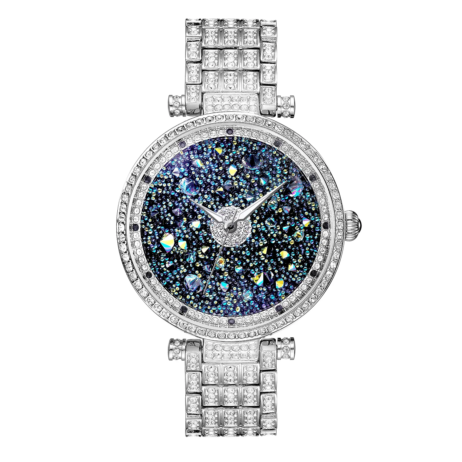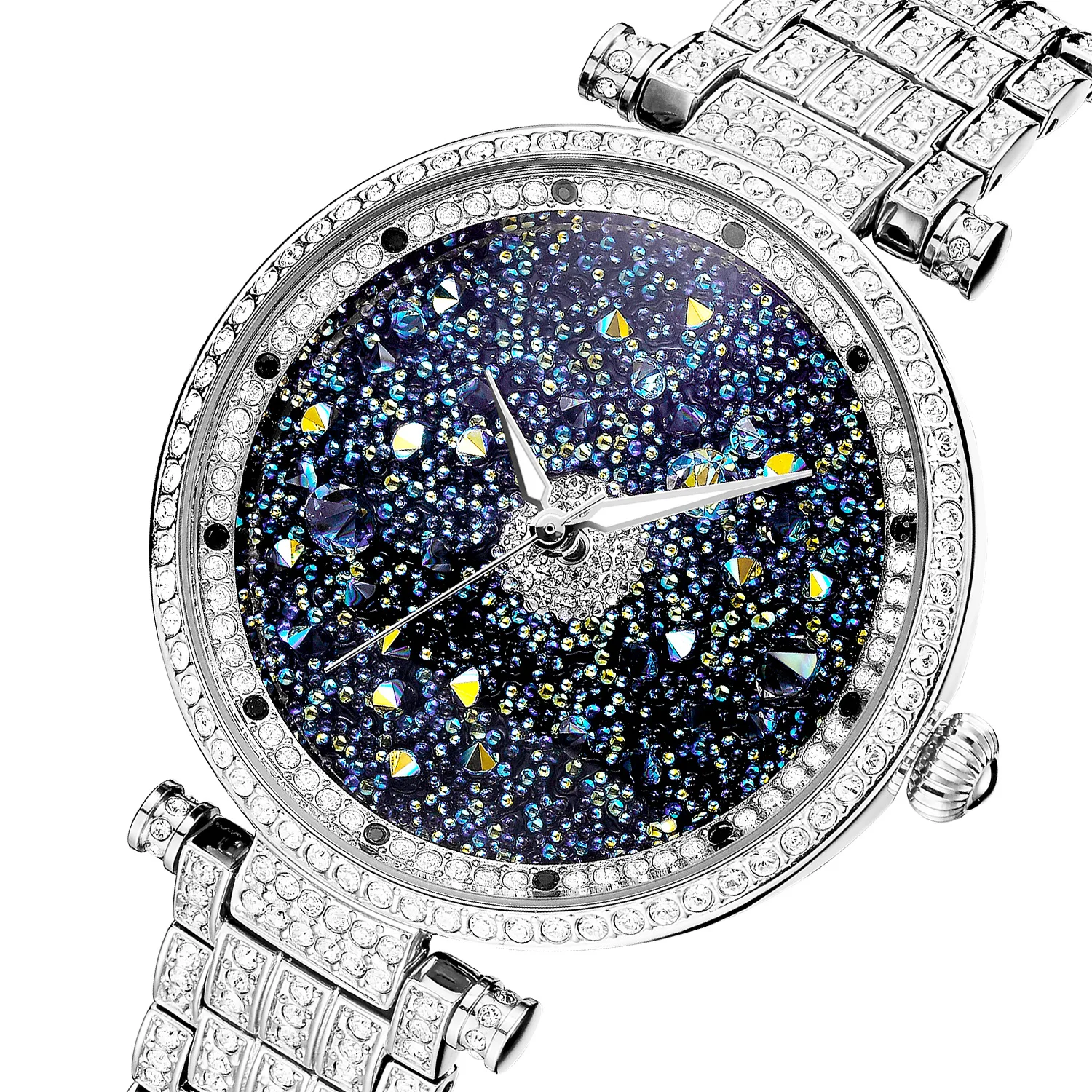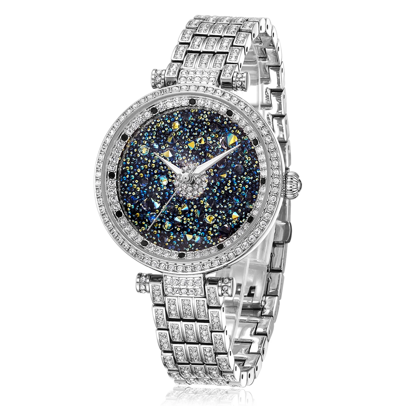 Импортированный кварцевый механизм из Японии, чтобы у вас было самое точное время в руке Врезанные кристаллы Австрии на все часы и твердое зеркало выдерживают испытание временем Шикарный и модный дизайн звездного неба - женские часы серебристого цвета подойдут под все ваше платье и лучший подарок Ежедневная водонепроницаемость, женские часы с бриллиантами водонепроницаемы 30 метров / 99 футов