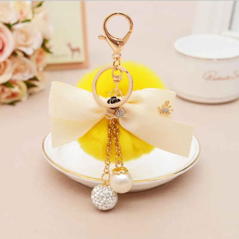 Меховой брелок с бантом и помпоном, брелок с помпоном из натурального меха кролика Рекс, брелок с помпонами из меха, брелок для сумки