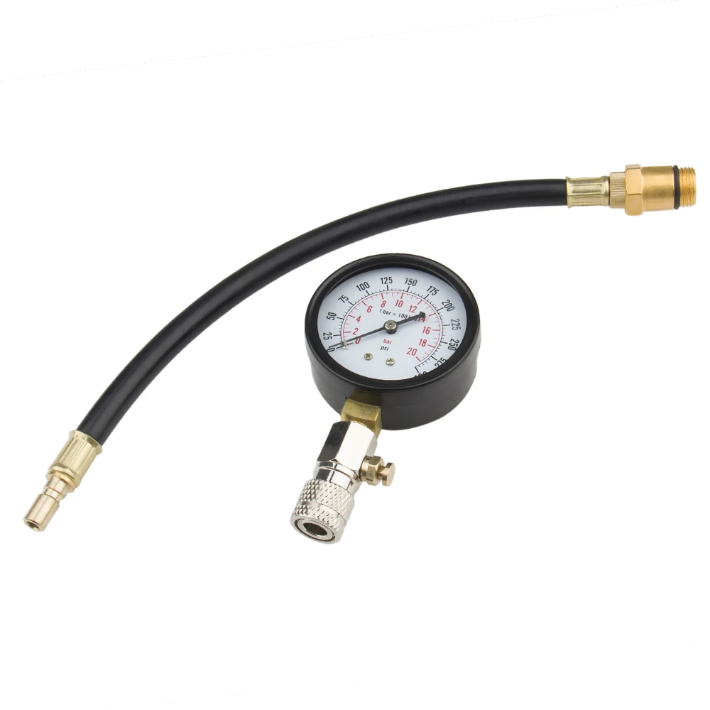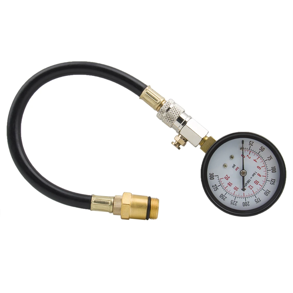 100% новый товар высокого качества. Проверка сжатия цилиндра от 0 PSI до 300 PSI. (От 0 до 21 кг/см2). Подходит для резьбы свечи зажигания 14 мм и 18 мм. Оснащен воздушным клапаном и кнопкой сброса манометра 11 дюймов гибкий шланг 2-3/4 "датчик