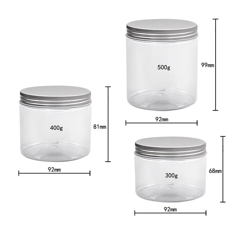 Емкость: 300 мл 400 мл 500 мл 300 мл Размер: 92 мм (D) X 68 мм (H) 400 мл Размер: 92 мм (D) X 81 мм (H) 500 мл Размер: 92 мм (D) X 99 мм (H) Материал: ПЭТ банка с алюминиевой крышкой/PP пластиковой крышкой Цвет: прозрачная банка + серебряная крышка/натуральная крышка Минимальный заказ: 12 шт./лот