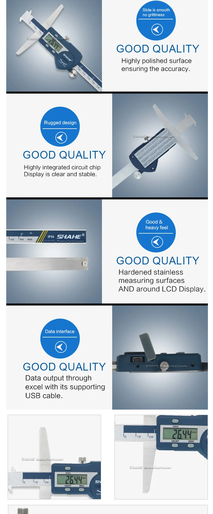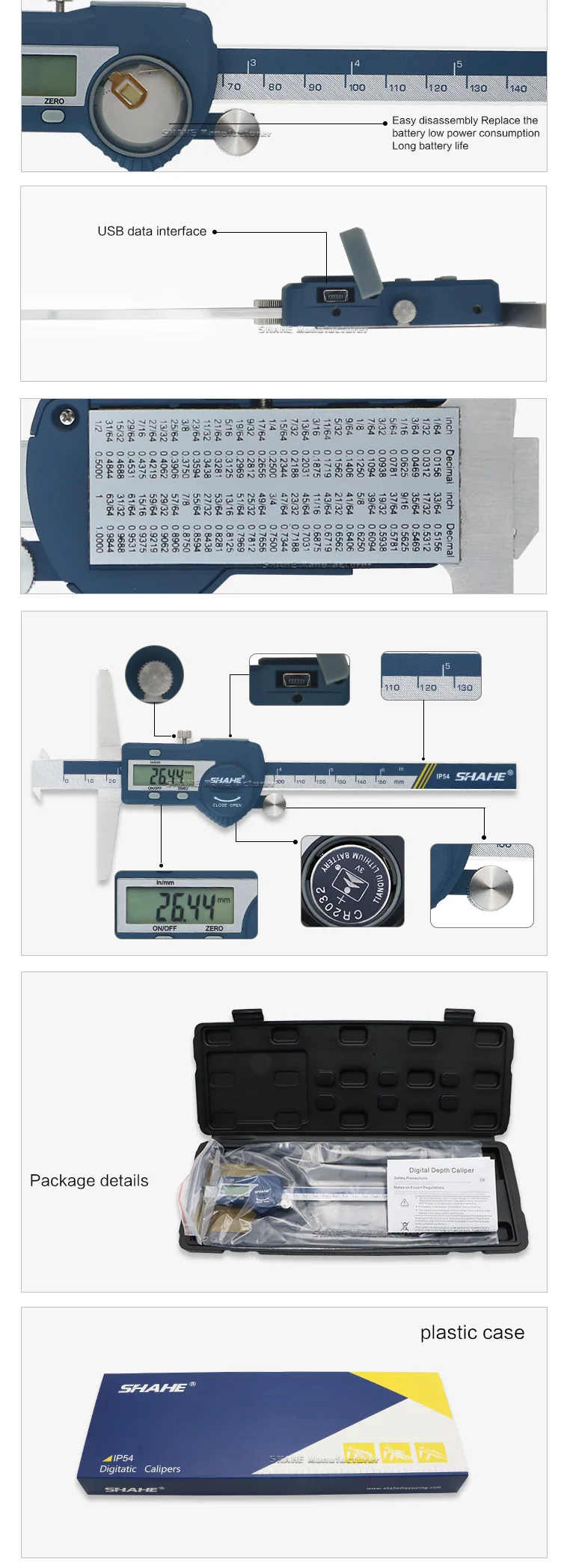 Характеристики 1. Рама из закаленной нержавеющей стали и мерные зажимы. 2. Обмена относительными/абсолютными измерениями в любом положении 3. Застеклённая сетка, стабильная и высокая точность 4. Быстрое отображение измеренного значения на ЖК-экране. 5. С выключателем питания ВКЛ-ВЫКЛ и автоматическим выключением на выбор. 6. Водонепроницаемый IP54. 7. Три функциональных клавиши. 8. Установка нуля в любом положении. 9. Конверсия системы измерения мм/дюйм. 10,3 в CR2032 Экологичная литиевая батарея, срок службы батареи> 1 год. 11. Точное измерение глубины, шагов и т. д. при обработке и домашнем использовании. Спецификация Наименование бренда: SHAHE Номер модели: 5113-150B Материал: нержавеющая сталь Аккумулятор: 3 в CR2032 (не входит в комплект) Диапазон измерения: 0-150 мм Разрешение: 0,01 мм Точность: +/-0,02 мм