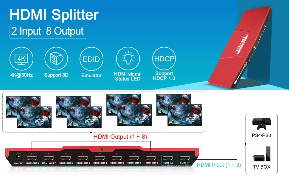 Переключатель сплиттер, TESmart 2 в 8 Out 4K x 2K @ 30Hz HDMI переключатель сплиттер 2x8 HDMI селектор, поддержка 3D HD 1080P с пультом дистанционного управления