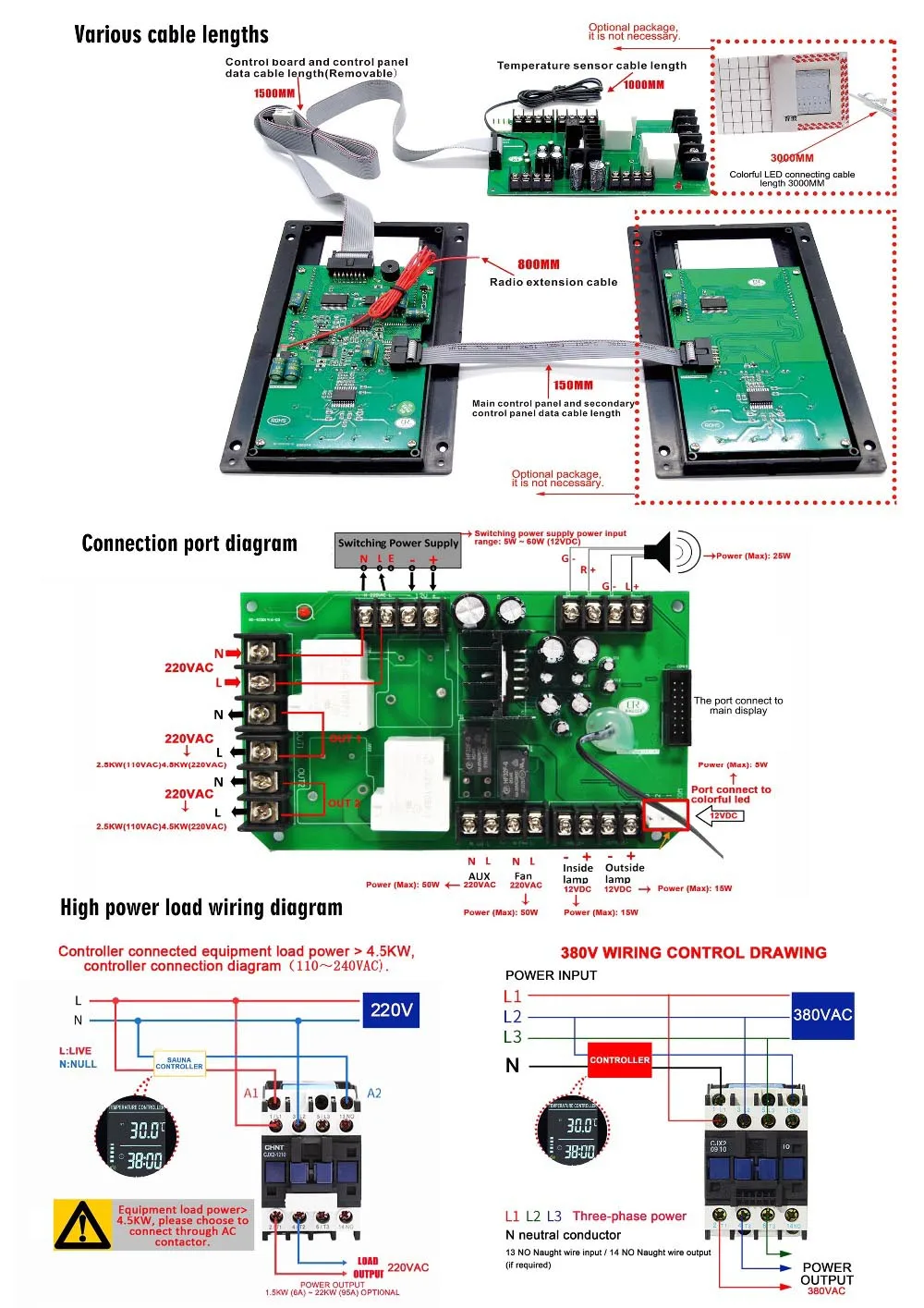 Диапазон измерения температуры: 0 ~ 110 °CНастройка времени: 1 ~ 99 минутРазрешение: 0,1 °CТочность: ± 1 °CИсточник питания: 220VAC ± 10%, или 110VAC ± 10% 50HZ/60HZВход: 1 NTC датчик (провод: 1 м для стандарта, может быть настроен)Внутренняя лампа/внешняя лампа: 12VDC/2AГромкий динамик: 12 В постоянного тока, динамик Impedance≥ 4 ОмВыход: два 30A реле параллельного выхода с контролем нагрева;Вентилятор: 10А реле; AUX Выход (УФ лампа или кислородный бар и т. Д.): 10АВыход тепла: резистивная нагрузка Макс. 4.5 кВт/220 В, 2.5 кВт/110 В(Если вы хотите подключить большую нагрузку, пожалуйста, купите контактора переменного тока на вашем местном рынке и подключите контактора переменного тока перед использованием.)Светодиодный блок цветотерапии: 5 Вт, произведенный производителем --- кабель 3 м;(Опционально)