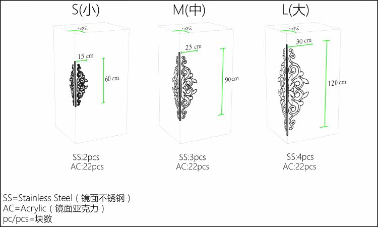 | 1. Единица измерения длиныСм. 2. ЗнакШт.Подставки для компоненты количество каждого размера. 3. Каждый узор состоит из нескольких частей, декоративных акриловых зеркал и зеркальных поверхностей, полос из нержавеющей стали. Например: SS 2 шт., подставки для 2 шт.Лента из нержавеющей стали. Переменного тока 18 шт., подставки для 18 шт.Акриловое зеркало. |