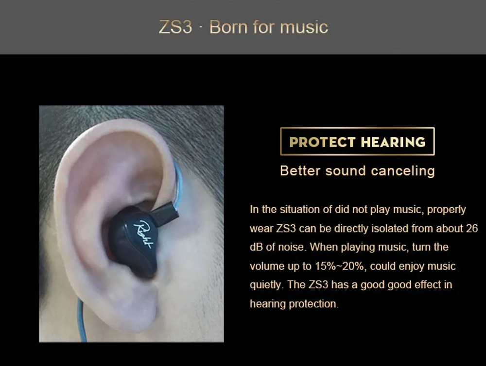 Лучшее шумоподавление В ситуации, когда музыка не проигрывается, правильно носить ZS3 можно непосредственно изолировать от шума около 26 дБ. При воспроизведении музыки Включите громкость до 15% ~ 20%, можете наслаждаться музыкой спокойно. ZS3 имеет хороший эффект при защите слуха.
