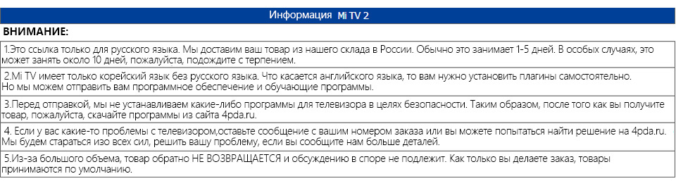 Порты HDMI3Тип подсветкиИз светодиодов светодиодКласс энергоэффективностиКласс 3Screen Aspect Ratio16:09Scan TypeprogressiveScan Rate60 HzOptimum Viewing Distance3 - 3.4mNumber of speakers2Network Connection TypeПроводной и беспроводнойНачало производстваМарт 2015 годаУпаковкаДаШирокоэкранная поддержкаДаФормат дисплея1080 P (Full-HD)Режимы работыSmart TVОперационная системаДругойBrand NameXIAOMIDisplay Size40 inchesInterface TypeHDMIResolution1920x1080Receiving SystemNTSCMeasurement unit100000015Each pack1XiaoMi ModelMillet tv 2 40 inch