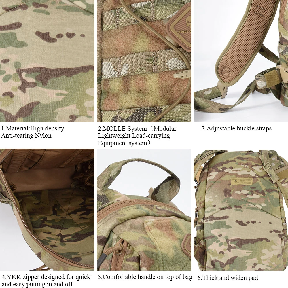 1) Материал: нейлон высокой плотности 2) система MOLLE (модульная Легкая система несущего оборудования) 3) регулируемые ремни с пряжкой 4) молния YKK предназначена для быстрого и легкого надевания и снятия 5) Удобная ручка сверху сумки 6) толстая и широкая подкладка | |