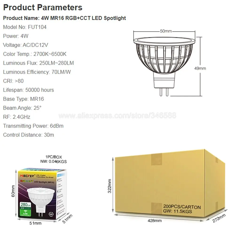 Лампа FUT104 RGBCCTТребуется дополнительный пульт Milight RGBCCT, чтобы получить его работу, также можно достичь управления Wi-Fi APP и третьего вечерние голосового управления при использовании с WL-Box1.