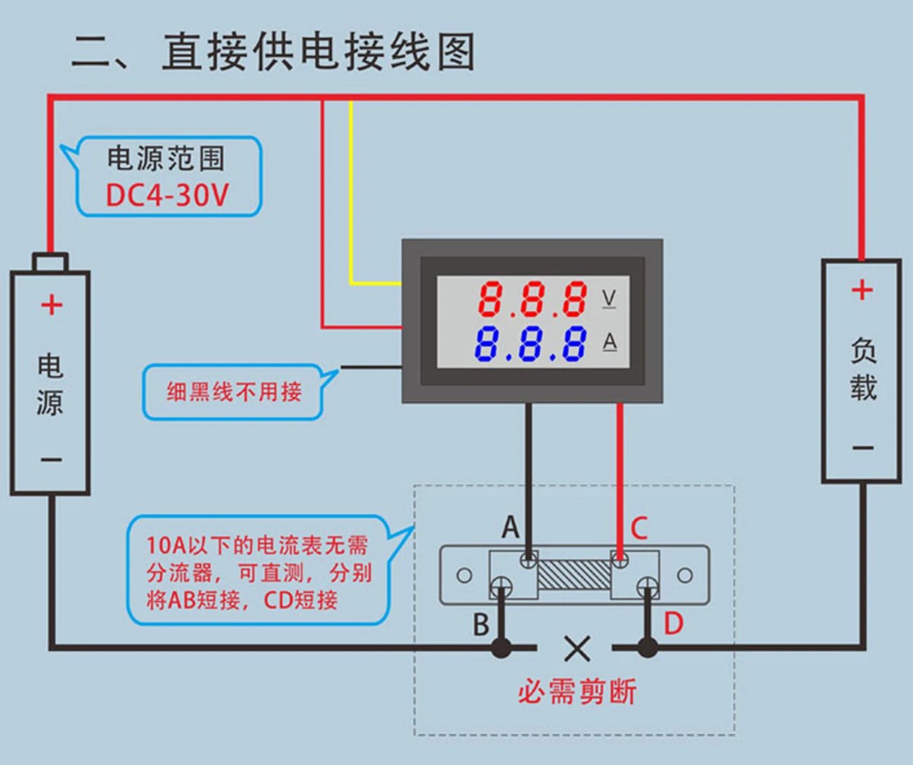 Без подключения шунта, подключите тонкие красные и черные провода к источнику питания. Ток счетчика с диапазоном 50 А отображается как 50,0 ~ 59,9, а ток счетчика с диапазоном 100 А отображается как 100-109.