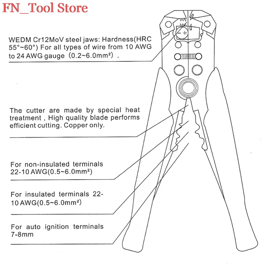 Особенности: Сверхмощная конструкция. Саморегулирующийся с рукояткой подушки. Легированная Сталь Челюсти: Твердость (HV550 - 650 / Rc52 - 57) для всех провода от 10AWG для 24AWG Манометр (0,2-6,0 мм). Резак изготовлен из точного покрытия (15N88 - 99 / Rc55 - 66 ), высококачественное лезвие эффективно режет. Для изолированных клемм 22 - 10AWG (0,5-6,0 мм). Для non-изолированных клемм 22 - 10AWG (0,5-6,0 мм). Для терминалов автоматического зажигания 7 - 8 мм. Для снятия изоляции с пластиковой или резиновой изоляцией в каждом отдельном, различных кабелей и проводов 0,5-6 мм кв. Диаметр зачистки можно отрегулировать автоматически для различных поперечных секций провода. С кусачки для медных и алюминиевых проводов, нарядные фатиновые юбки нитка для сверления отверстий диаметром до 6 мм кв, с переключением между дальним и нитка до 0,5 мм кв. Материал: углеродистая сталь.