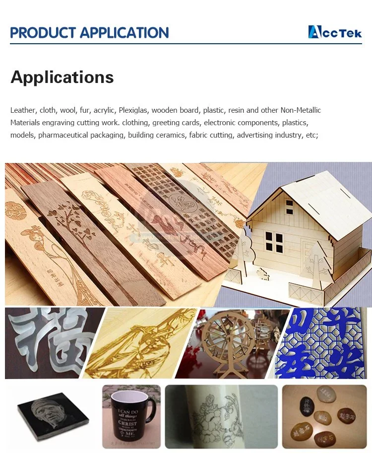 1. Режущая головка: одна/двойная лазерная головка делает резку/гравировку более эффективной, она широко используется в тканевой промышленности, для большого количества резки/гравировки одежды.