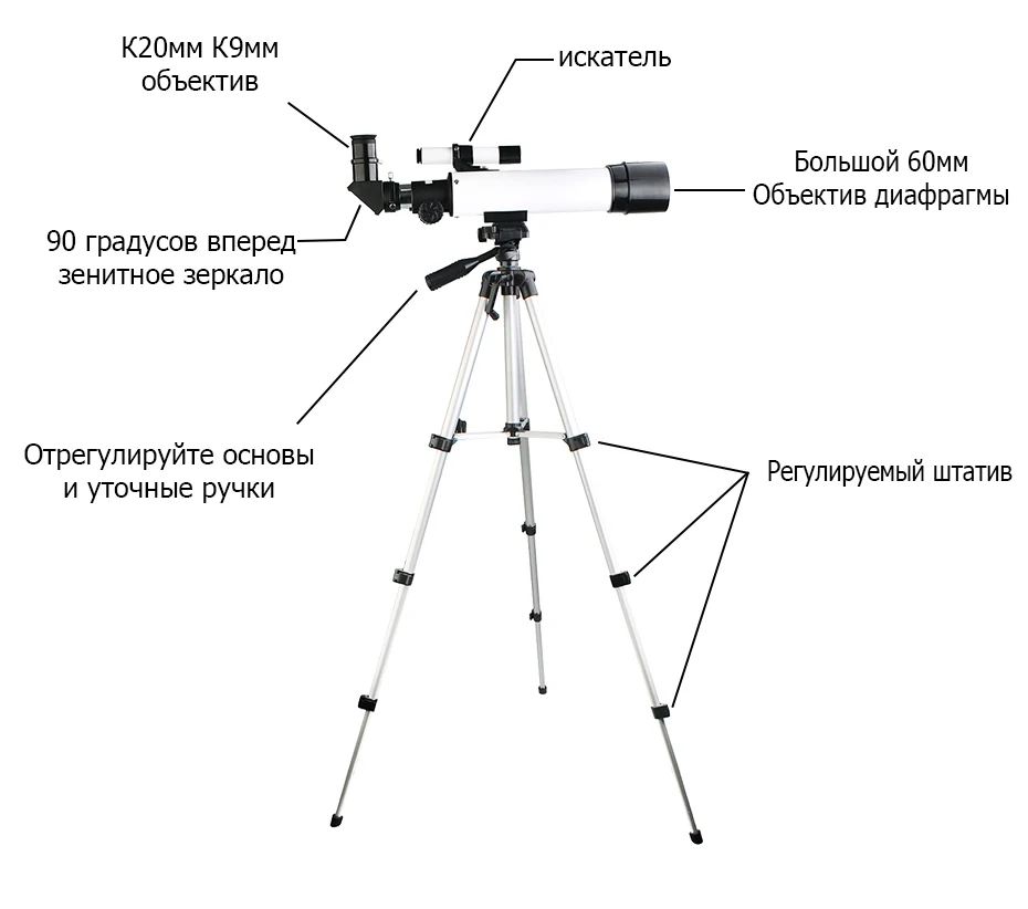 1XОптическая труба 1X60 мм 1XАлюминиевый штатив 2X 1,25 "окуляры: K9mm K20mm 1X5x20 Finder Scope 1X90-градус 1,25 "диагональ зеркал 1X Руководство пользователя