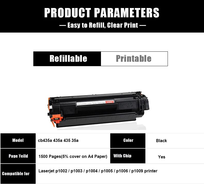 1 совместим тонер-картридж CB435A для Laserjet P1002 P1003 P1004 P1005 P1006 P1009 P1505 P1560 P1566 P1600 M1120 M1130 M1132, принт, 1500 страниц A4 бумаги при температуре не выше 5% позволяет закрыть всю спину. Хороший результат печати