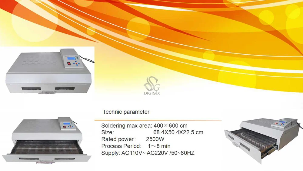 Выходная мощность достигает 2500 Вт, принятие быстрого инфракрасного излучения и циркуляции ветра для тепла, поэтому температура очень точная и даже, весь процесс пайки, чтобы завершить автоматически для вас выбор температуры