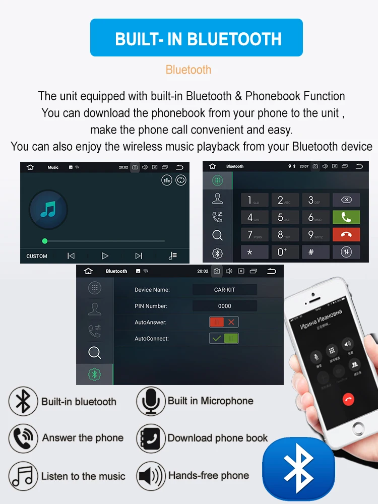 ОС Android 10,0 поддерживает 3G/4G (опционально), Wi-Fi, Bluetooth, вход камеры заднего вида, gps-навигация, AUX;USB, язык: английский, японский, немецкий, испанский, французский, тип установки: din размер оборудования: 8 ядер ОЗУ: 4 Гб ПЗУ: португальский, итальянский и т. Д. 64G гладкий и быстрый экран реакции, захватывающий и мультисенсорный экран, радио с высоким разрешением, Встроенный RDS Радиоприемник, функция радиочастотной области: FM87.5-108 МГц; AM522-1620KHz мультимедийный параметры Формат музыки: MP3,WMA,AAC,RM, lfac изображение Fomat: JPG,BMP, JPEG, GIF,PNG, совместимый диск: MP4,MP3,MP2