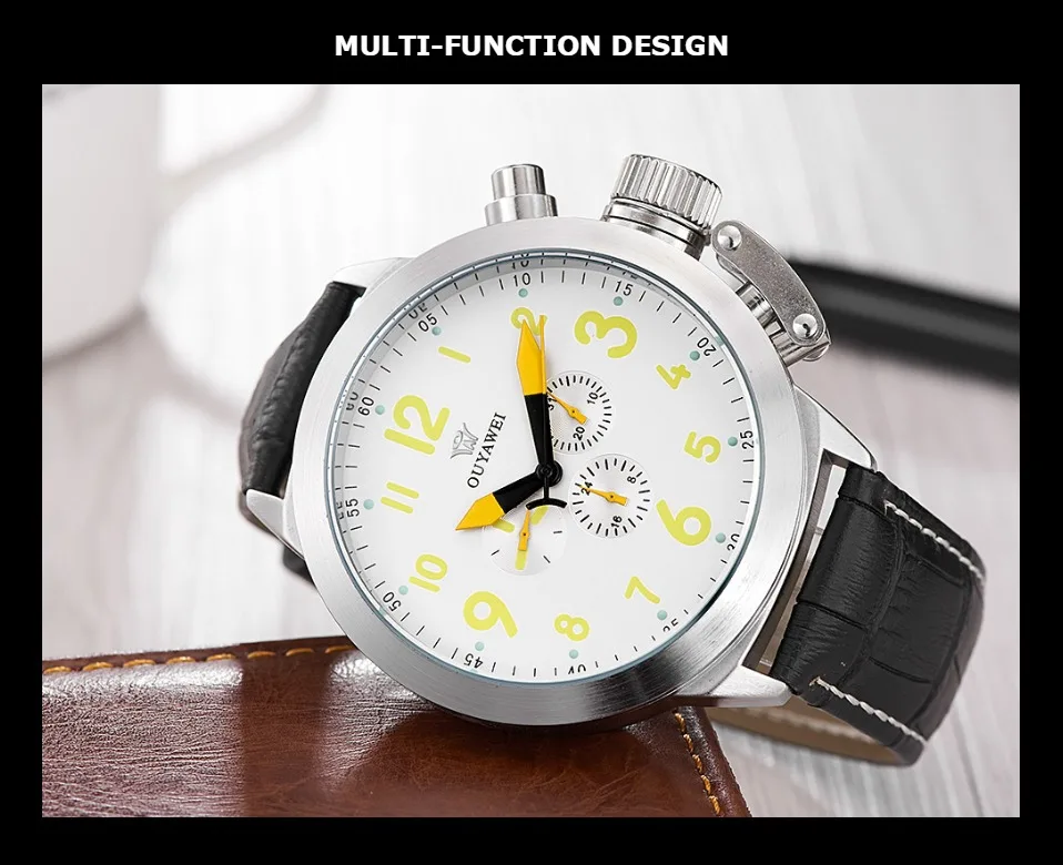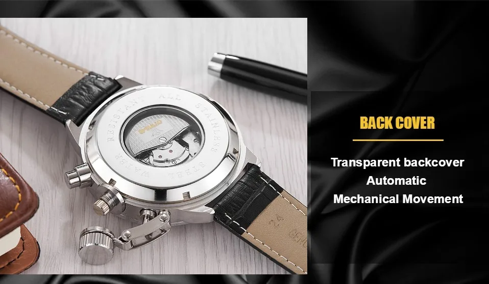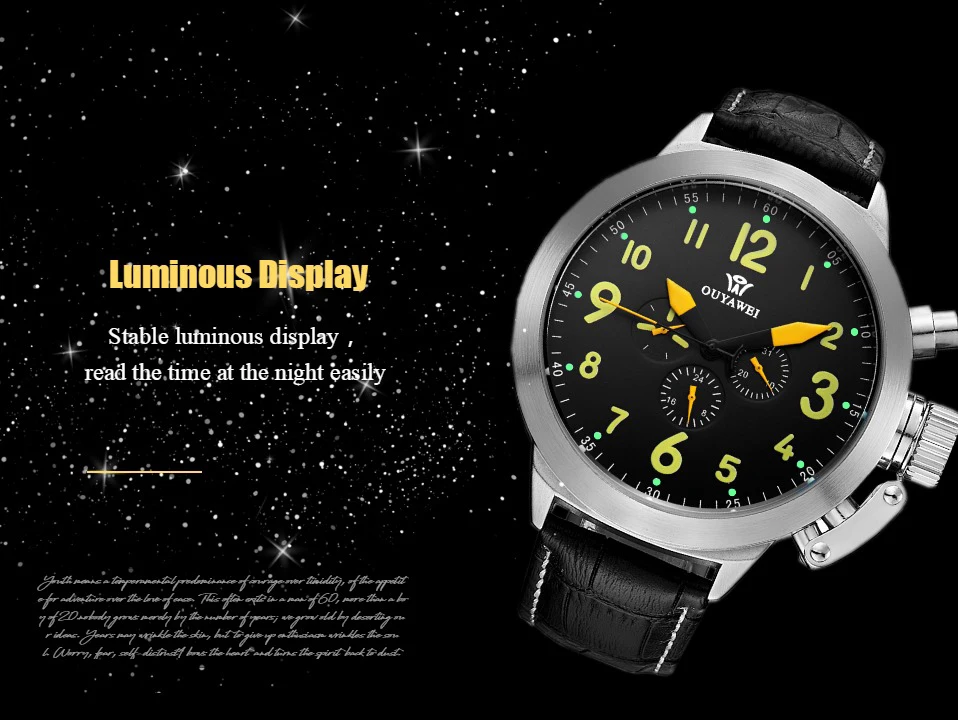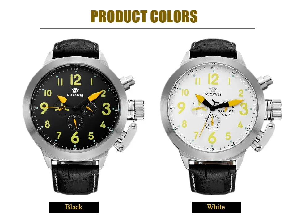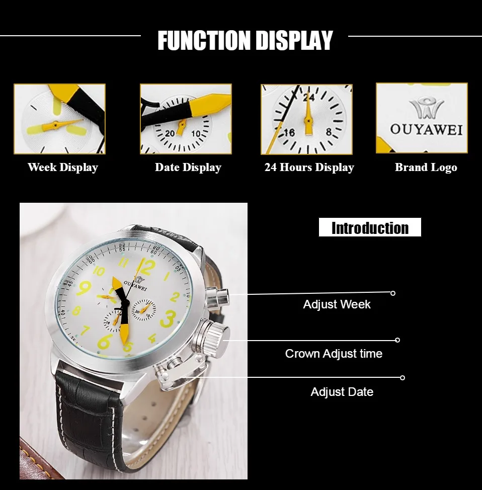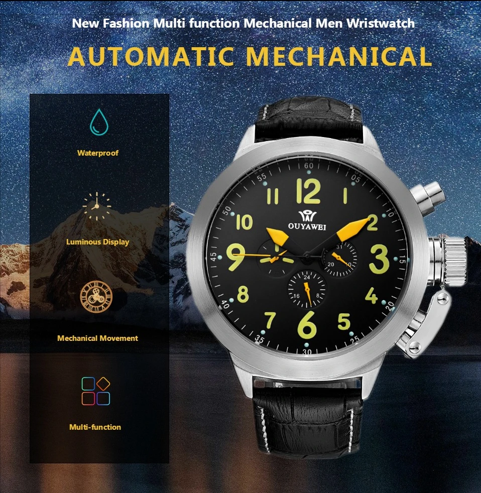 1. 100% Бренд новый высококачественный 2. Механическое автоматическое движение, питание от встряхивания, батарея не требуется 3. Кожаный ремешок для часов и круглый чехол для часов из сплава. 4. Ежедневная водостойкость до 3атм. (Пожалуйста, не нажимайте кнопки под водой) 5. Три маленьких циферблата-отображение недели, отображение 24 часов и даты