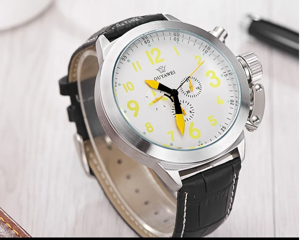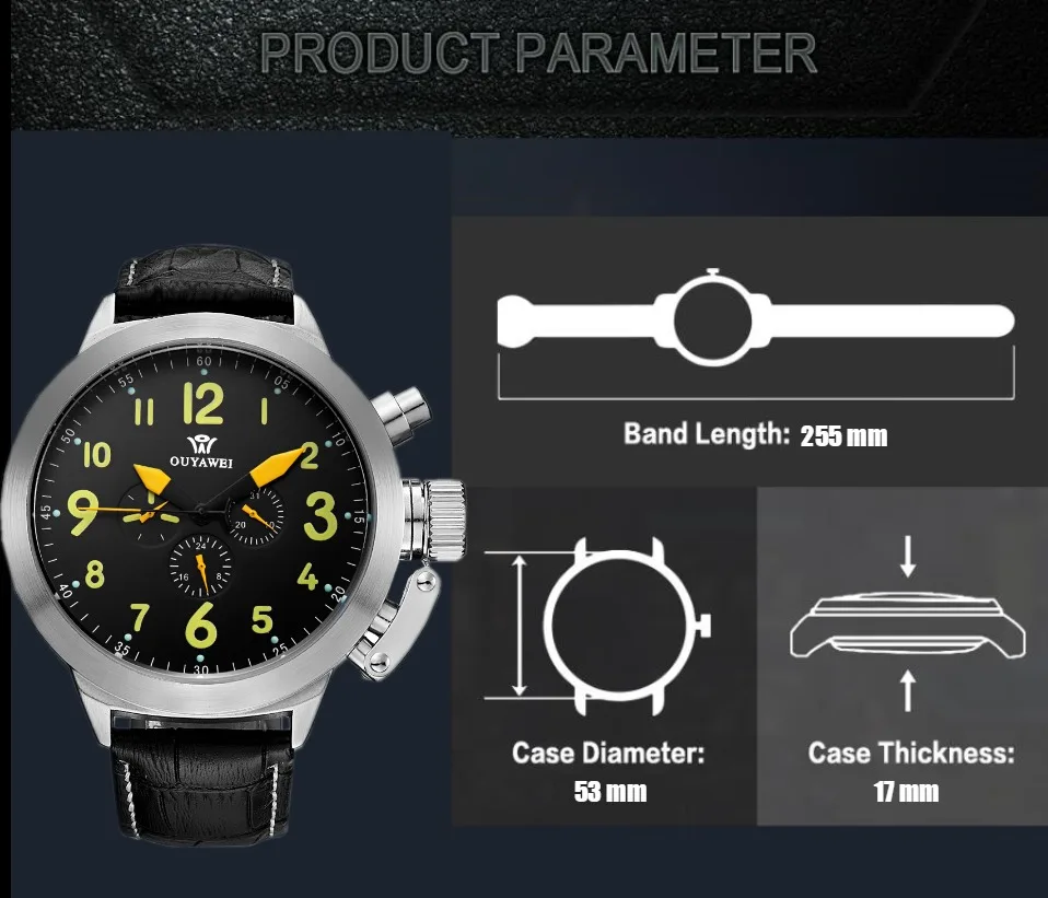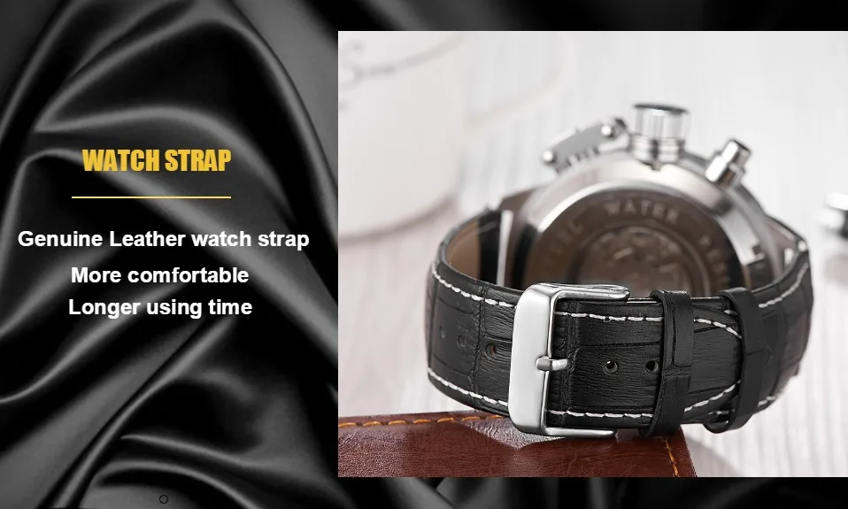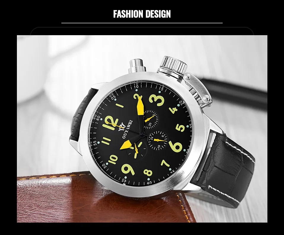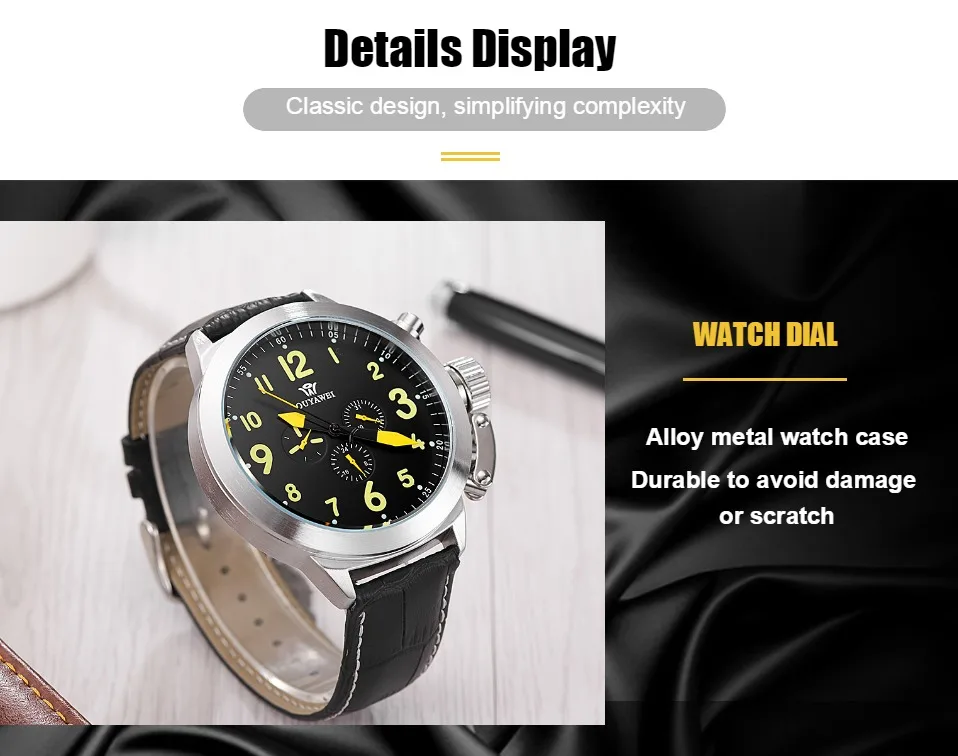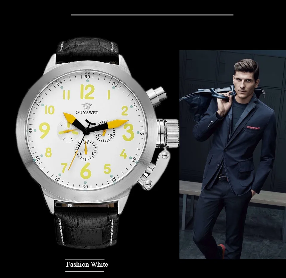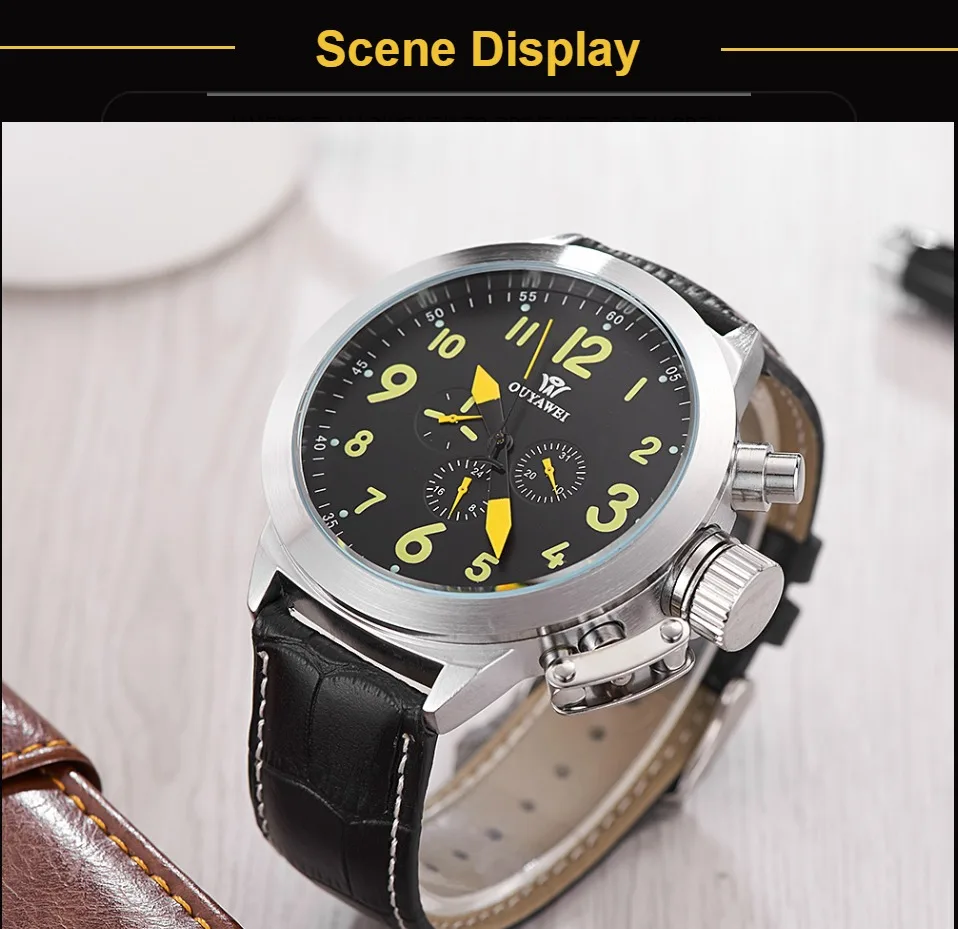 1. 100% Бренд новый высококачественный 2. Механическое автоматическое движение, питание от встряхивания, батарея не требуется 3. Кожаный ремешок для часов и круглый чехол для часов из сплава. 4. Ежедневная водостойкость до 3атм. (Пожалуйста, не нажимайте кнопки под водой) 5. Три маленьких циферблата-отображение недели, отображение 24 часов и даты