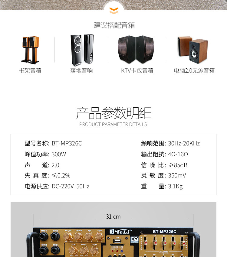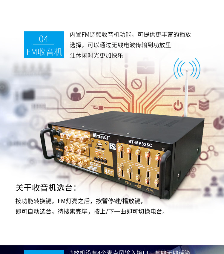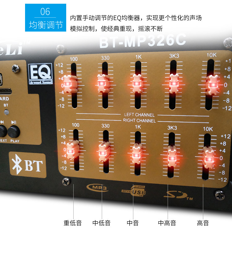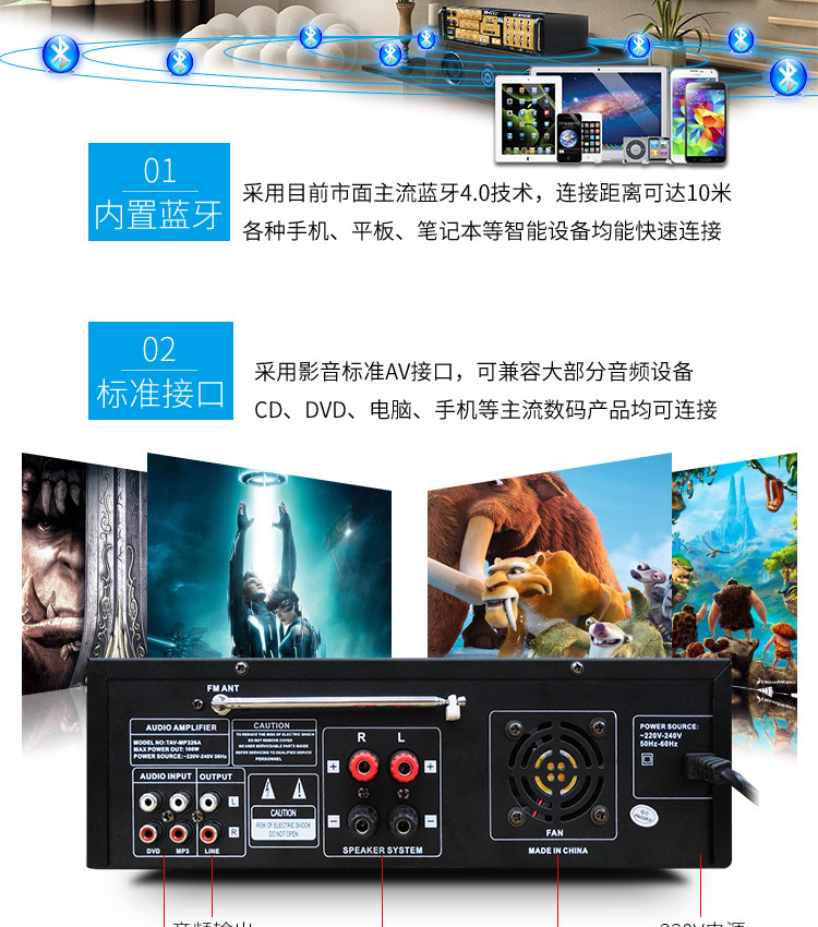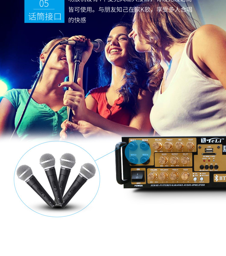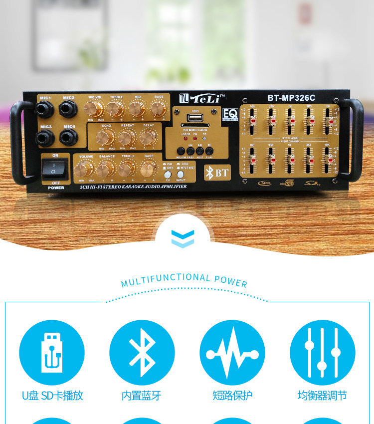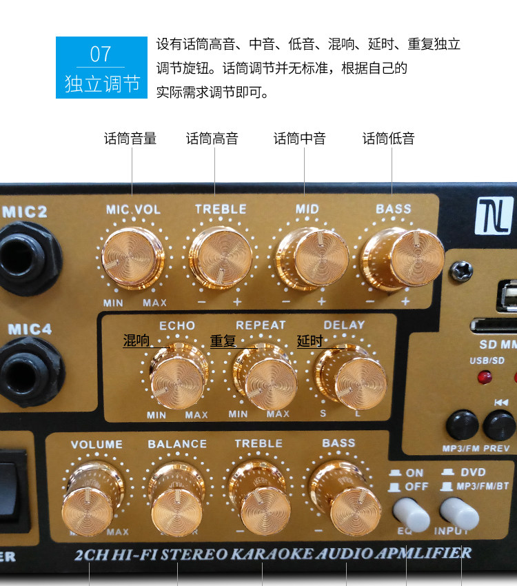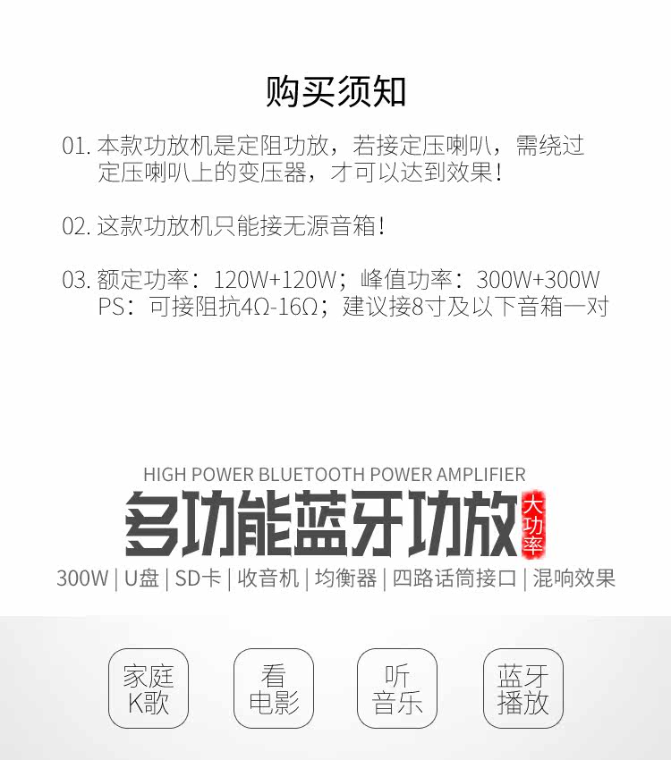 2: Сопротивление: 4-8 Ом 3: можно подключать только пассивные динамики. Это усилитель постоянного сопротивления. 4; Многофункциональный; Поддержка USB SD, воспроизведение, с Bluetooth, защита от короткого замыкания, регулировка эквалайзера, регулировка реверберации, задержка, высокие частоты, регулировка среднего уровня, fm-радио, 5: Этот усилитель не имеет дистанционного управления