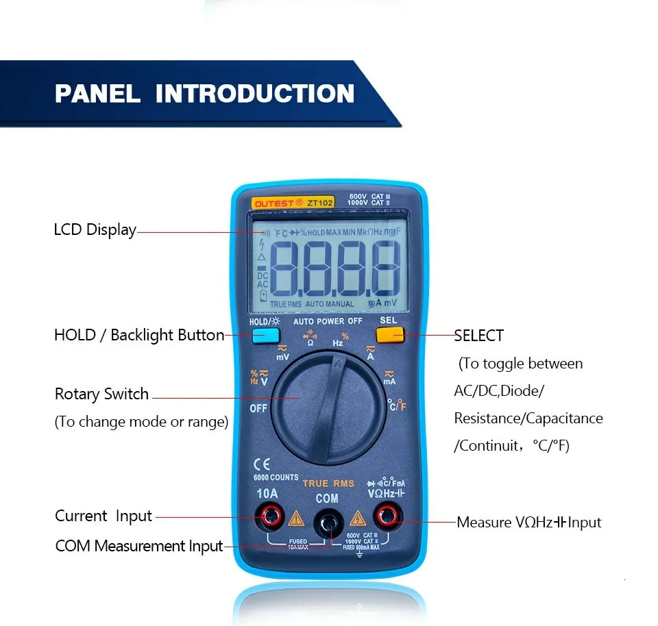 Автоматический цифровой мультиметр ZT102 6000 отсчетов подсветка AC/DC трансформирующий Амперметр Измеритель сопротивления емкости температуры
