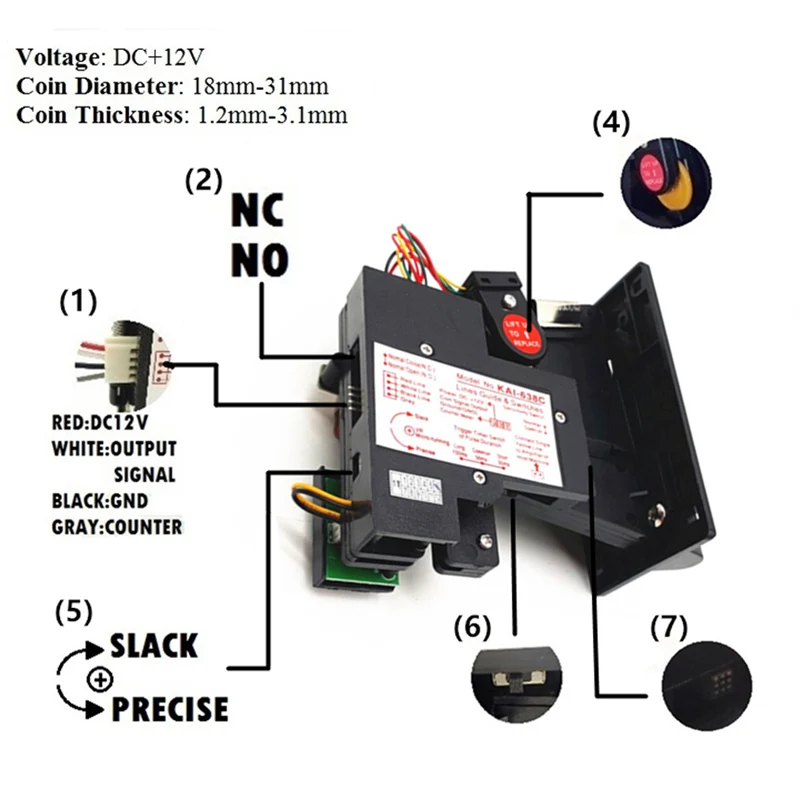 7. Переключатель нормального открытия и нормального закрытия для выхода сигнала проверки монет.