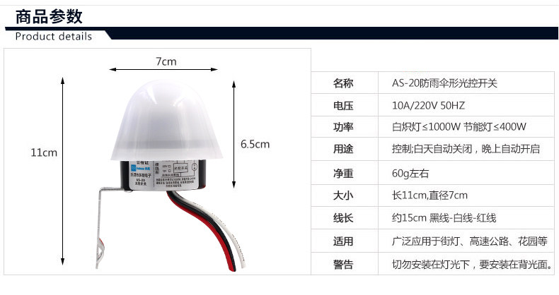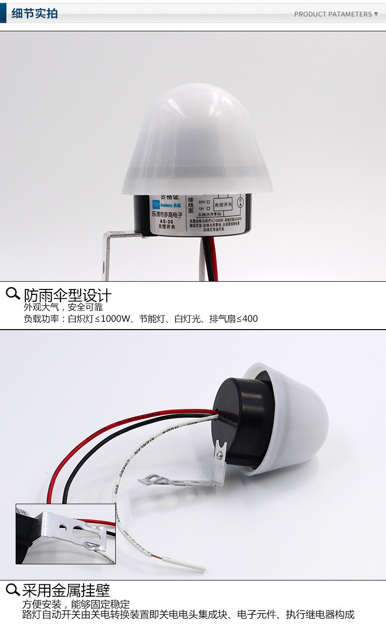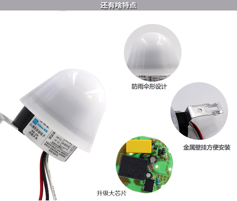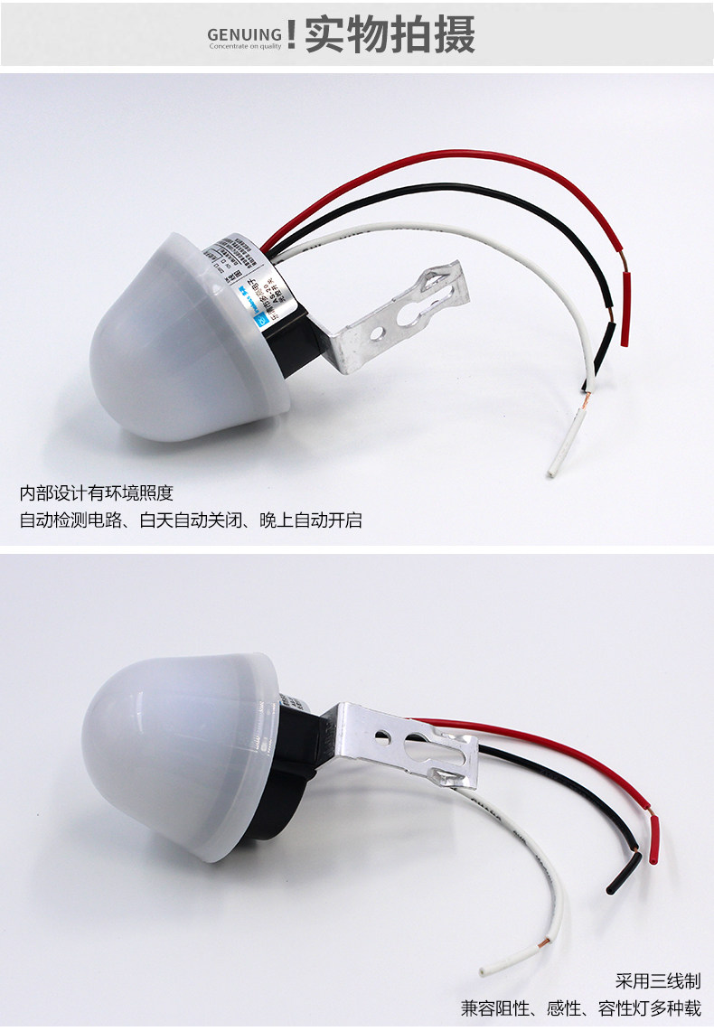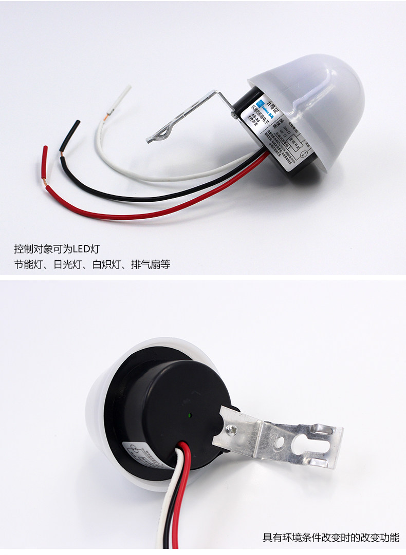 Автоматический выключатель уличного фонаря состоит из электрического коммутационного устройства, электрической закрывающей головки, встроенный блок, электронного компонента и реле управления. Уход за день отличается прочностью, Фоточувствительный элемент ток увеличивает, интегральная схема релейный выход, уличный светильник s не яркие, к вечернему в некоторой степени, за счет уменьшения количества светильник рисунки светились фоточувствительный элемент низкого напряжения, релейный светильник s до следующего утра, Светильник запускает действие, чтобы снова усилить интегрированный автоматический светильник.