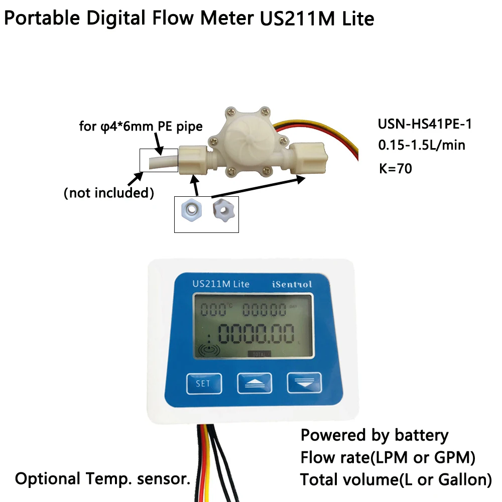 US211M Lite цифровой расходомер и USN-HS41PE-1 0,15-1.5LPM датчик общего объема и расхода