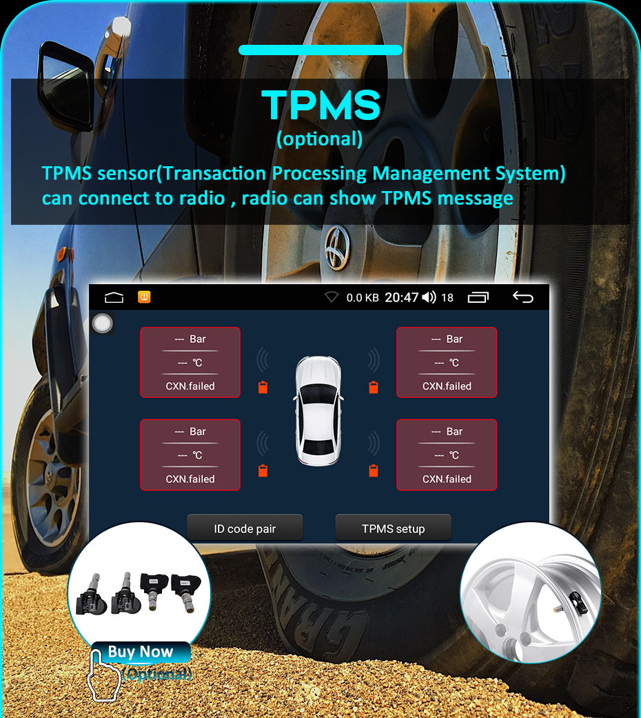 Радио может совместимо с системой контроля давления в шинах (TPMS). Когда вы подключаете TPMS к радио, вы можете видеть, что TPMS приводит к радиоэкрану. Радио также совместимо с внутренними TPMS и внешними TPMS. Если вы хотите купить TPMS, нажмите на эту фотографию.