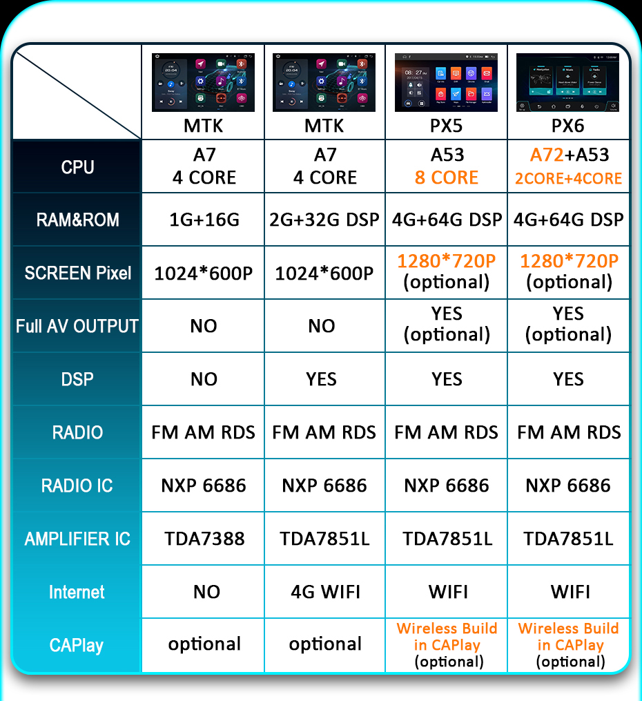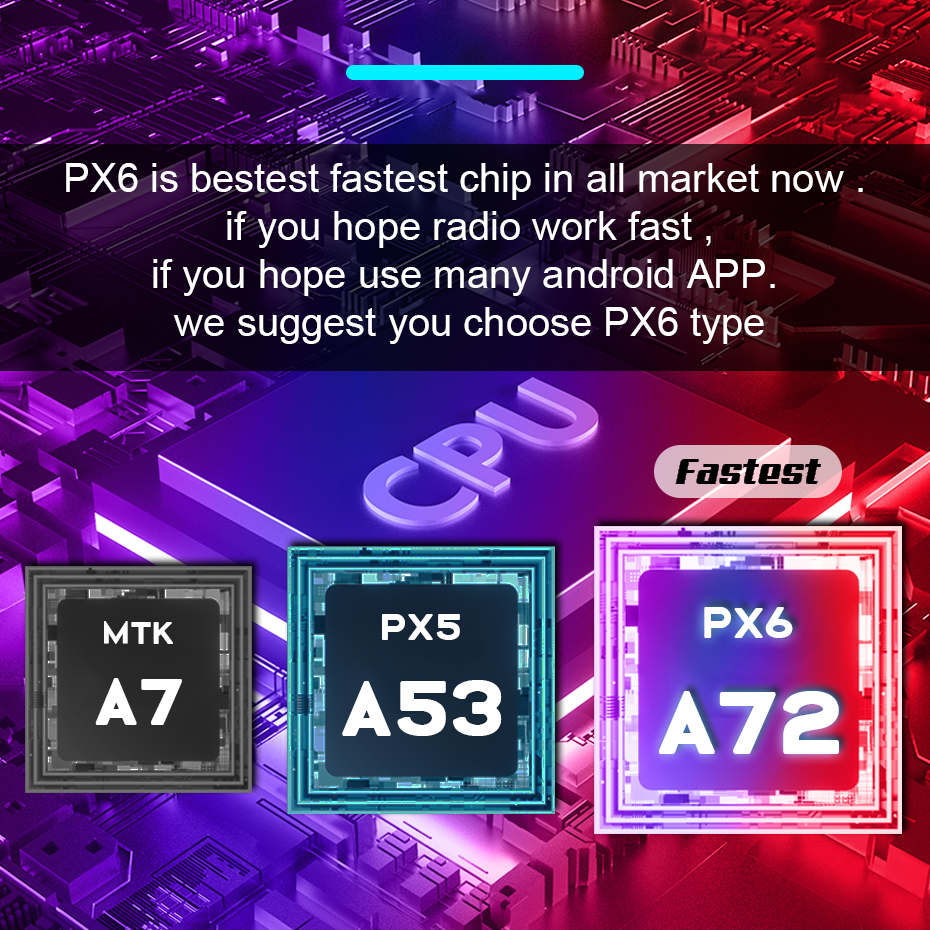 PX6 является лучшим чипом на рынке в настоящее время, он работает быстрее, чем все другие типы. Балл ANTUTU составляет 160770, что лучше 7853 4G + 64G, PX5 и всех других типов 4 + 64G на рынке. По сравнению с другими радио типа fo, PX6 radio может загружать больше видов приложений android с android market, и приложение может работать лучше.