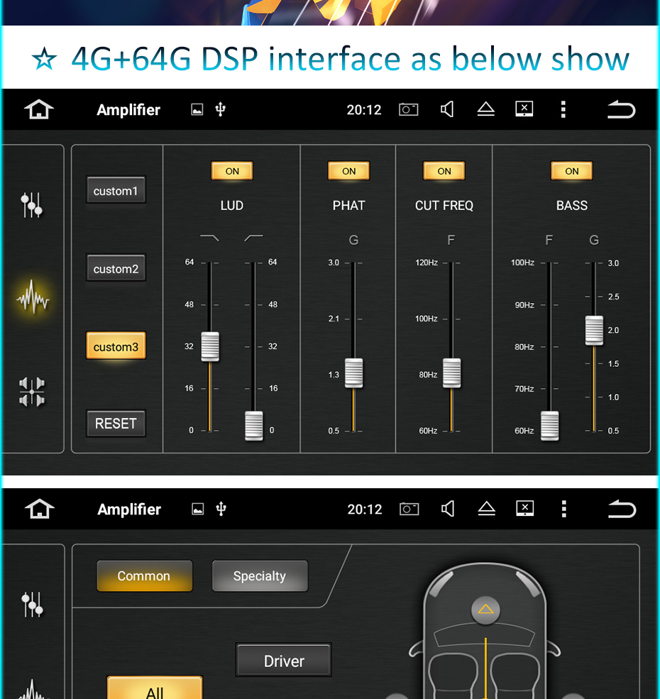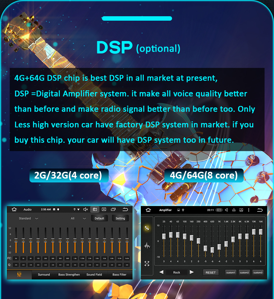 DSP-это цифровая система усилителя, она использует цифровой сигнал, она делает звук автомобиля лучше, чем раньше. PX5 и PX6 DSP-лучший DSP на рынке, пожалуйста, не беспокойтесь о количестве эквалайзера, пожалуйста, чувствуйте наше качество звука px5/px6 радио, это очень хорошо.