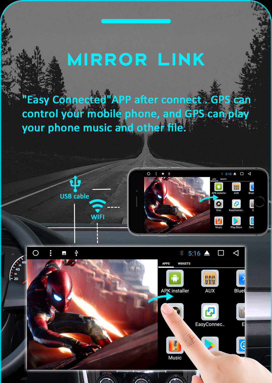 Вы можете подключить свой мобильный телефон к этому радио с помощью функции mirror link. Экран Радио покажет мобильный телефон, как зеркало. И радио может управлять ваш мобильный телефон, так что вы можете слушать мобильный телефон музыку или совершать звонки через радио экран.