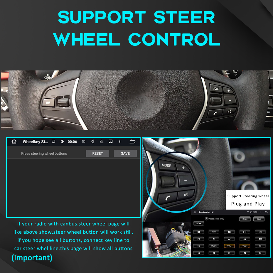 Все радиоприемники в нашем магазине поддерживают функцию управления поворотным колесом. Кнопки рулевого колеса вашего автомобиля могут управлять нашим радио после установки радио. (однако страница рулевого колеса обычно пуста. Если вы хотите увидеть кнопки aoo на странице рулевого колеса, вы можете просто подключить ключевую линию к линии рулевого колеса автомобиля, тогда вы увидите все кнопки рулевого колеса на странице)