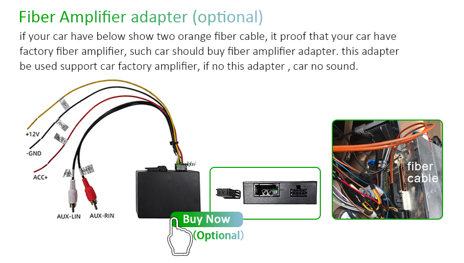 Если на вашем автомобиле ниже показаны два оранжевых волоконных кабеля, это доказательство того, что у вашего автомобиля есть Фабричный волоконный усилитель, такой автомобиль должен купить волоконный усилитель адаптера. Этот адаптер используется для поддержки заводского усилителя автомобиля, если нет этого адаптера, автомобиль без звука.