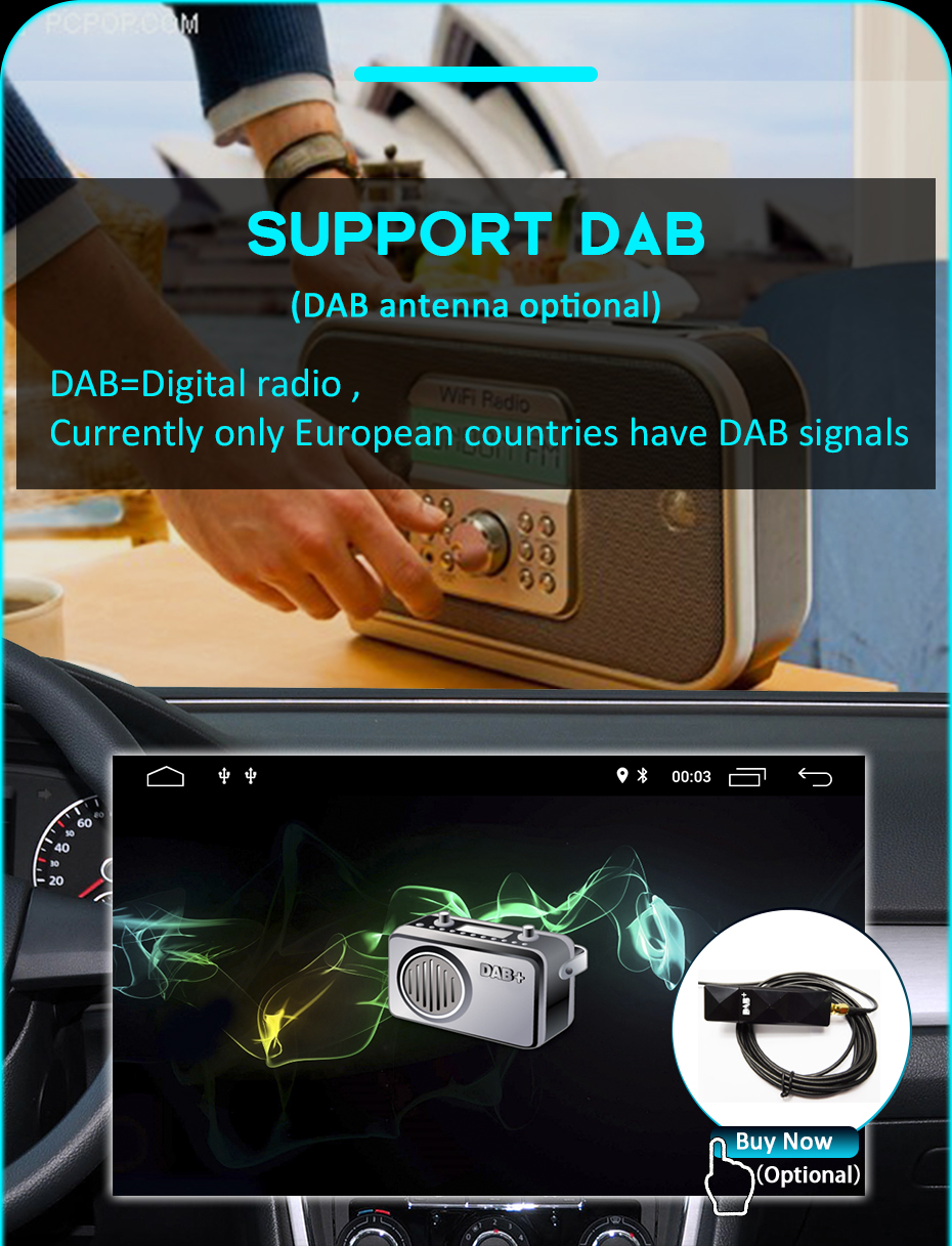 DAB-Это цифровое радио. Если в вашем городе есть цифровой радиосигнал, мы предлагаем вам купить DAB антенну, это гораздо лучше, чем FM AM RDS, он работает идеально без шума. Если нет цифрового радиосигнала, пожалуйста, не покупайте его.