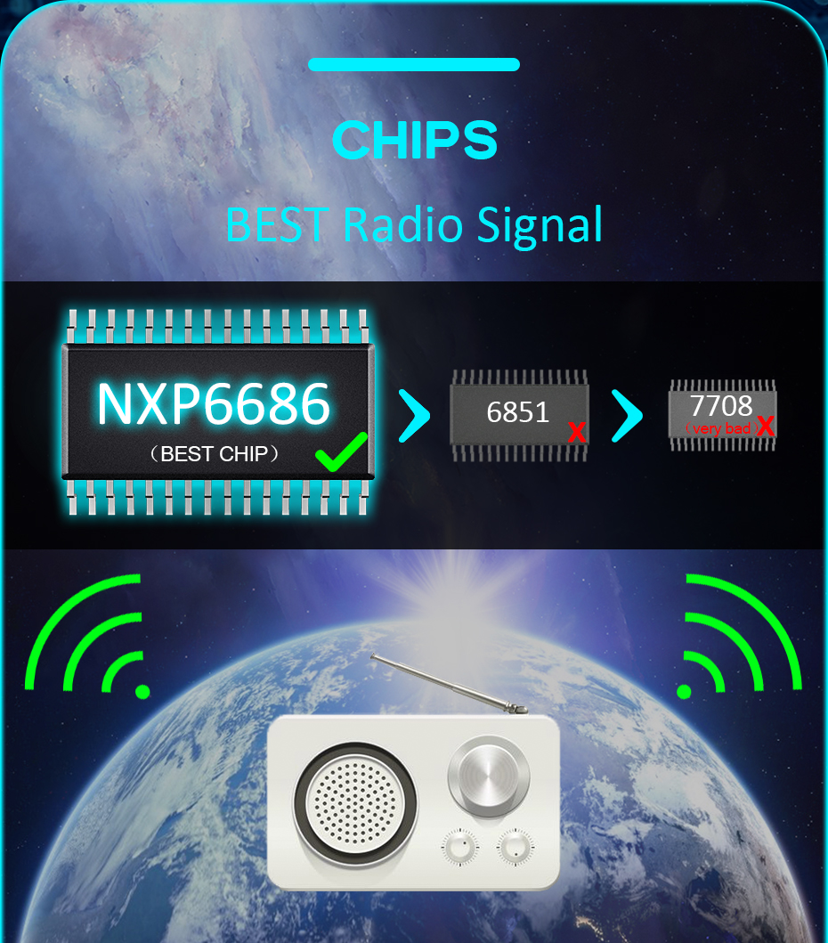 Чип NXP6686 является лучшим радиочипом, и лучше than7708,6851 и любой другой радиочип. Это лучший радиочип на рынке в настоящее время. Хороший радиочип делает радиосигнал более сильным.