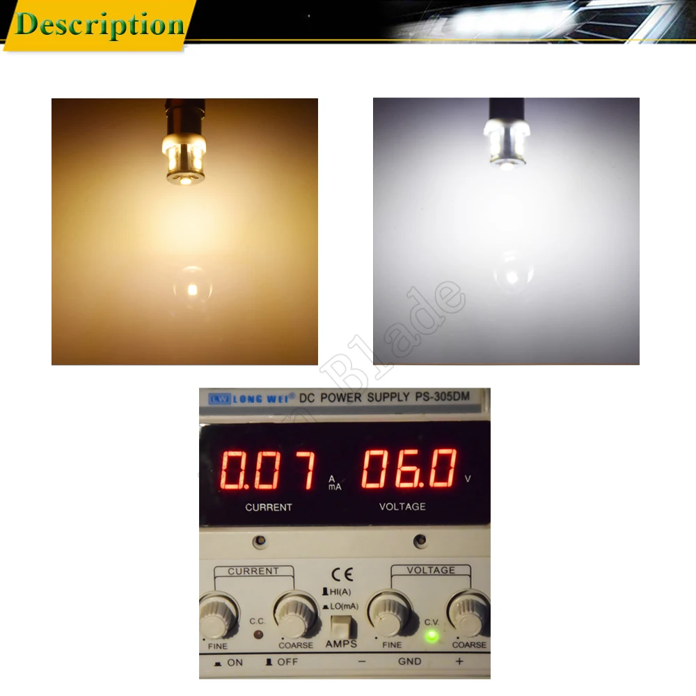 1. Товар: E10-2835-7SMD-WW 2. Напряжение: 6 В постоянного тока ("+" в нижней части, "-" в корпусе) 3. Светодиодный чип: 7 шт. 2835 SMD 4. Количество чипов: 7SMD 5. Цвет: теплый белый 4300k, белый 6000k 6. Срок службы: до 50000 часов 7. Сертификация: CE, ROHS 8. Гарантия: 12 месяцев 9. Угол луча: 360 градусов 10. Выходной ток: 70 мА ± 20 мА (Протестировано на 12 В постоянного тока) 12. Вес нетто: 10 г 13. Содержание Pacakge: 4 шт. E10 светодиодный светильник 14. Использование: светодиодный фонарь/фонарик