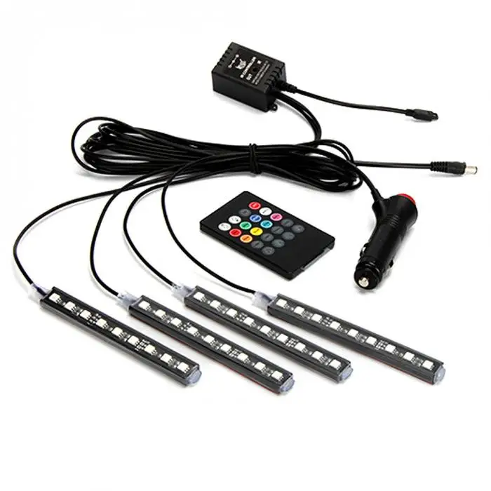 16 цветов RGB светодиодный комплект освещения салона автомобиля, беспроводной пульт дистанционного управления музыкой позволяет изменить цвет и настроить яркость по вашему желанию, кроме того, функция активации звука позволяет вам наслаждаться удовольствием, изменяя цвет после вашего автомобиля стерео музыкальный ритм, а также ваш голос.